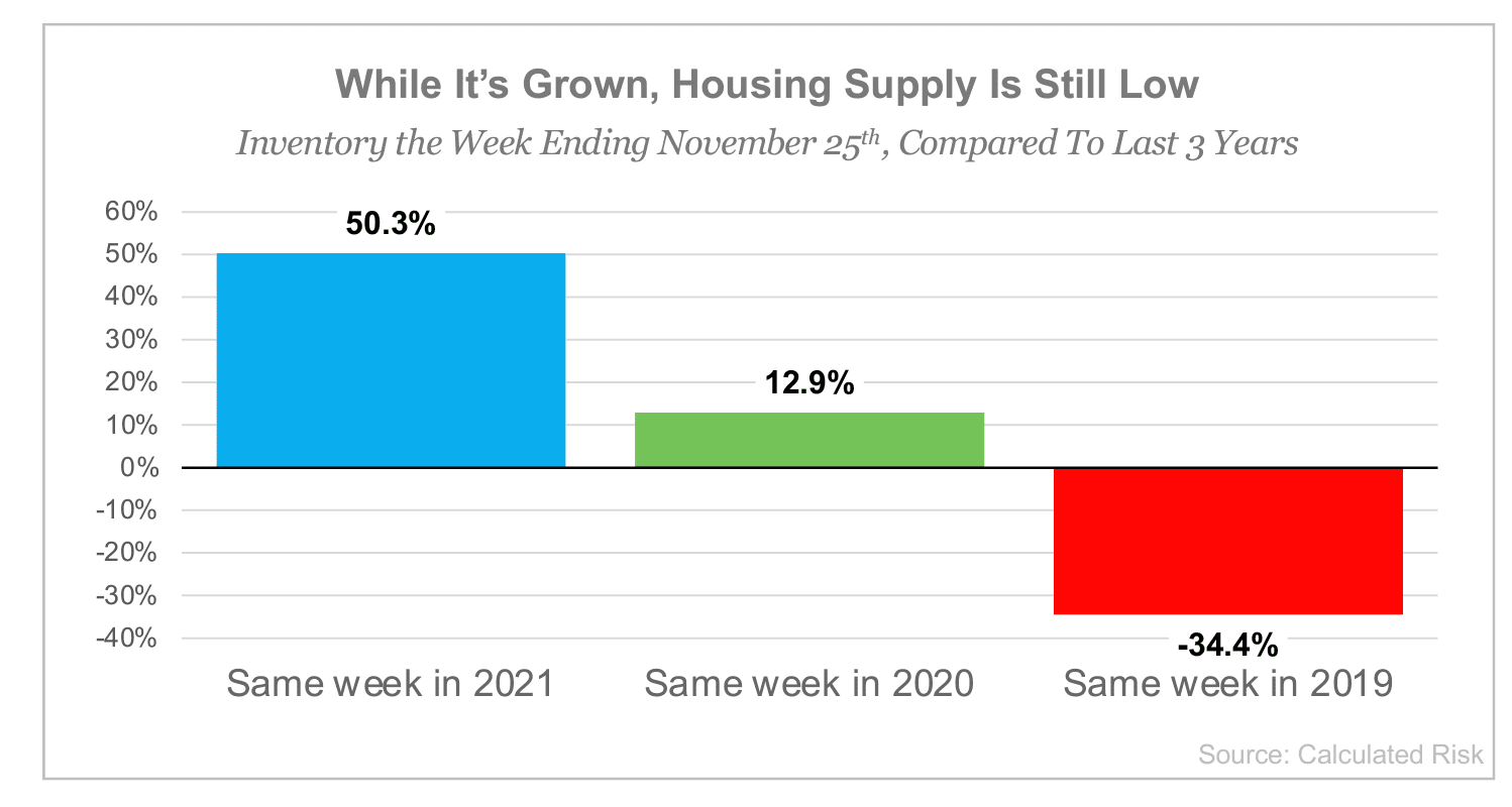 An article from Calculated Risk helps put the inventory gains the market saw in 2022 into perspective by comparing it to recent years (see graph below). It shows supply has surpassed 2021 levels by over 50%. But the further back you look, the more you’ll understand the bigger picture. And if you go all the way back to 2019, the last normal year in real estate, we’re roughly 30% below the housing supply we had at that time.
