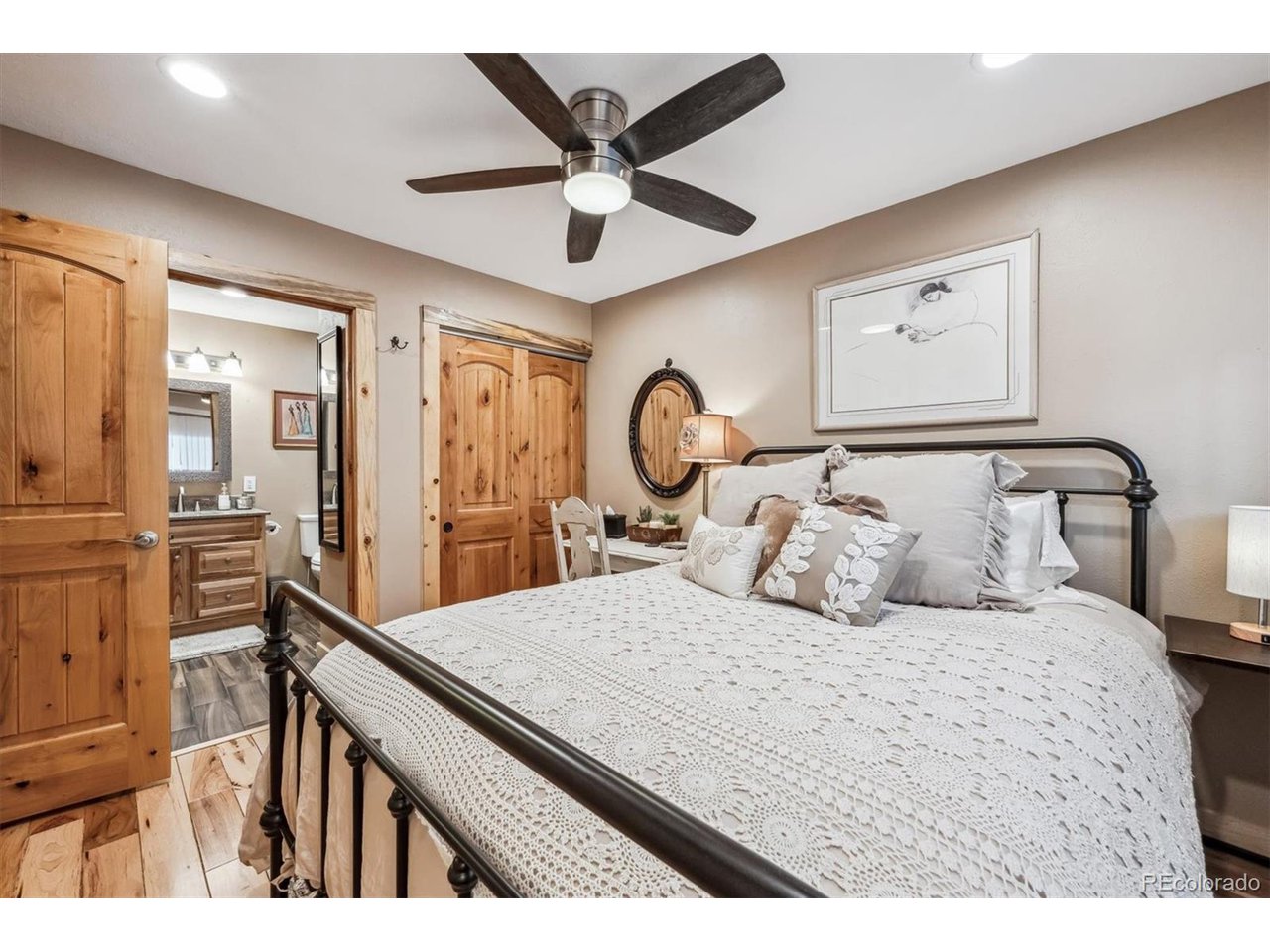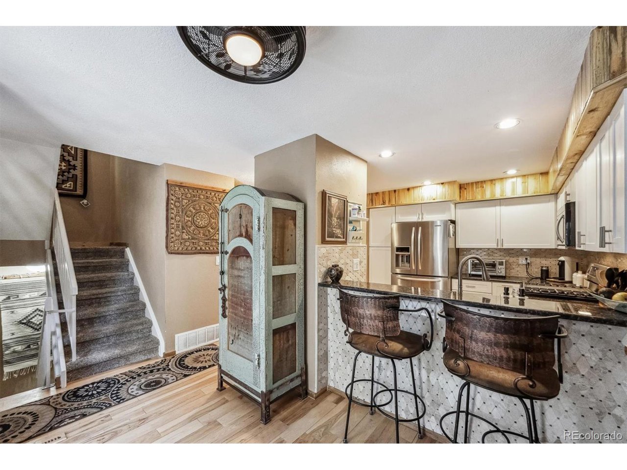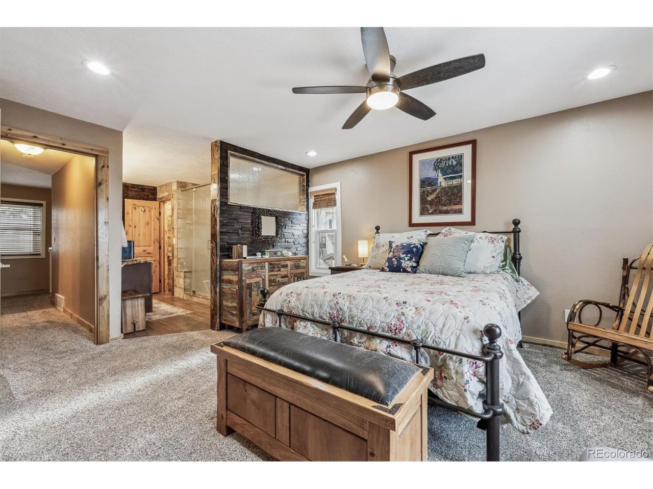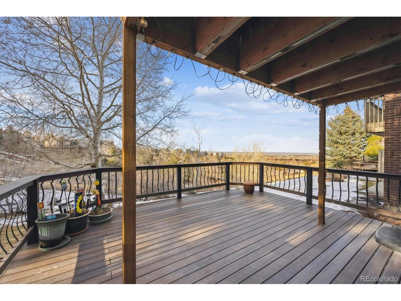 Perched atop a hill with incredible city views, this fully remodeled home in highly sought-after Amberwick backs to a peaceful greenbelt and offers a rare opportunity to own a truly turnkey home in an unbeatable location. Every surface has been upgraded and modernized, creating a space that is both stylish and functional. Step inside to discover new carpet and hickory wood floors that flow seamlessly throughout. The remodeled kitchen is a chef's dream, featuring white cabinetry, granite countertops, custom pine beetle trim, a tile backsplash, stainless steel appliances, and a gas cooktop. The primary suite is a tranquil retreat with breathtaking views, plantation shutters, a walk-in closet with custom built-ins, and a luxurious en-suite bath. The spa-like bathroom includes heated floors, a new vanity, a stunning shower with a soaking tub, and custom tile work. All bathrooms have been beautifully remodeled, including a newly added 3/4 bath in the finished walkout basement. Speaking of the walkout basement, it has been transformed into a super-cool "cabin retreat", complete with a modern LED fireplace-a perfect space for entertaining or relaxing. Additional features include a radon mitigation system, laundry cabinets, and a utility sink for added convenience. Enjoy the outdoor oasis with two expansive new trex decks, offering unmatched views of the city and surrounding landscape. Whether you're entertaining guests or enjoying a quiet sunset, these decks provide the perfect setting. Major updates include all new doors throughout, a new furnace, A/C, water heater, electrical panel, lighting, ceiling fans and a brand-new roof with gutters-giving you complete peace of mind. This home is perfectly positioned just 1/4 mile from the North Access Green Mountain Trailhead, providing instant access to hiking and biking trails. Conveniently located near downtown, Golden and major highways (6th Ave, C-470, I-70), this home offers both serenity and accessibility.