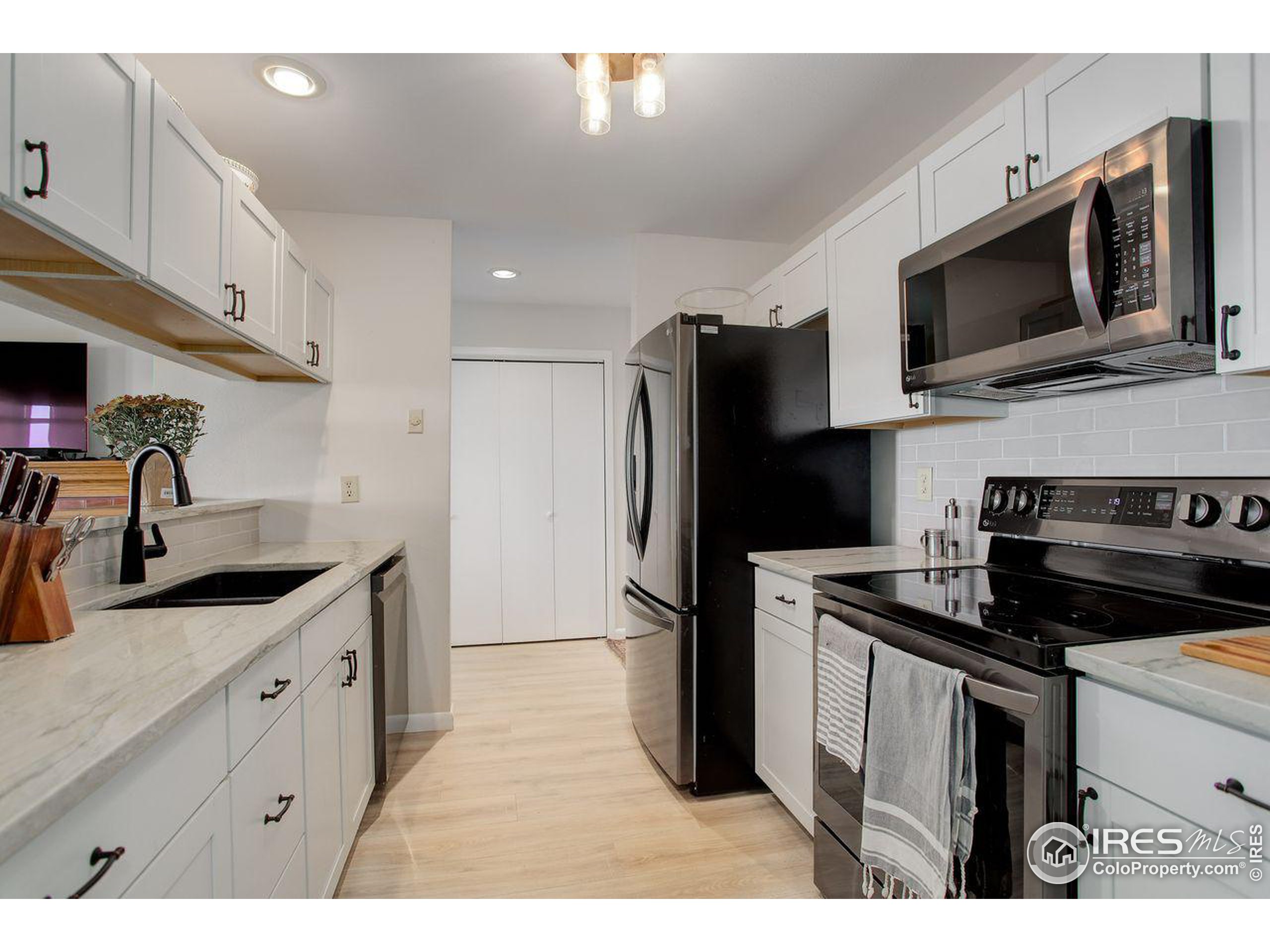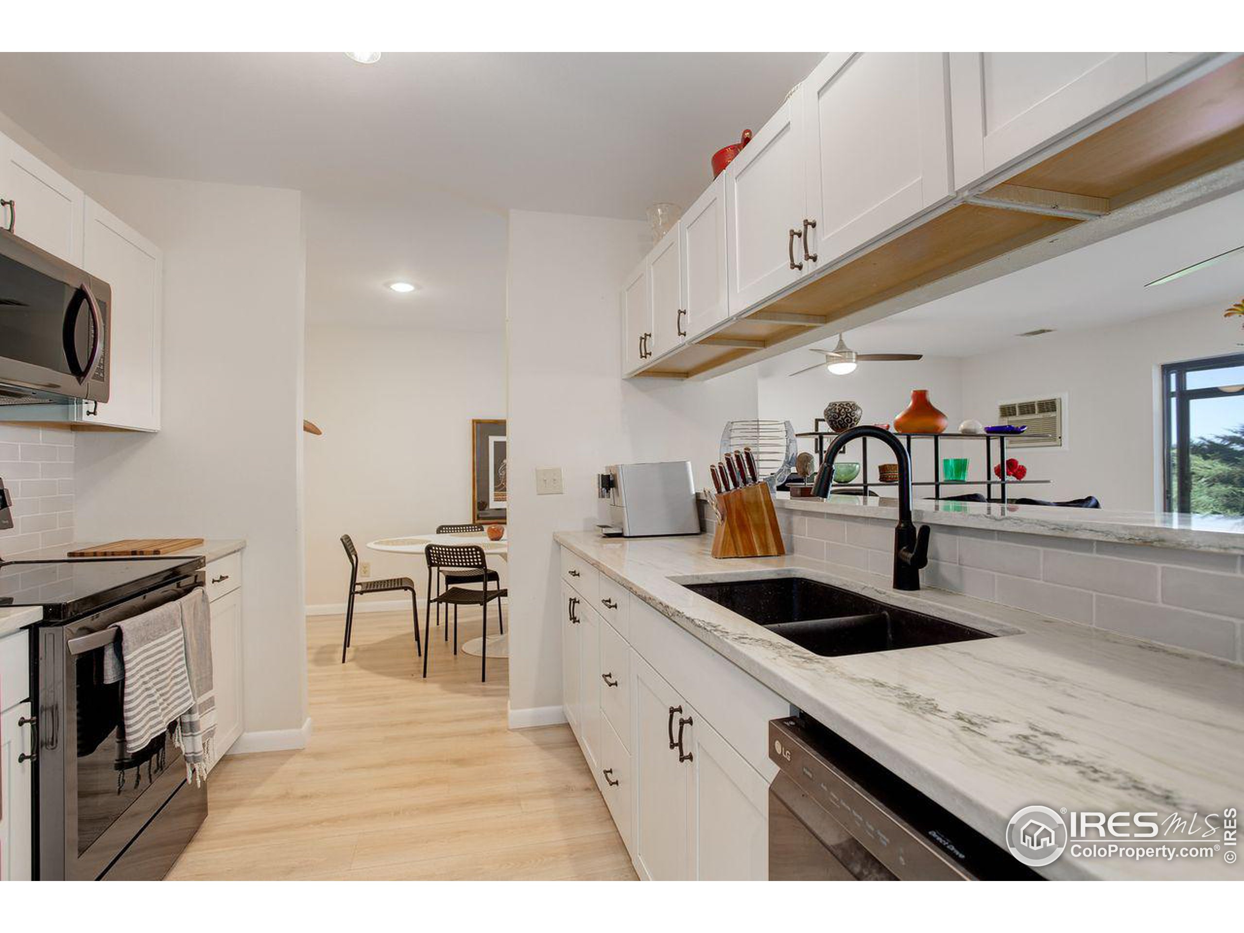 New price! Gorgeous South Facing Views of Mesa Open Space! You will love the privacy of this beautifully renovated ground-floor, lock and leave with open space views from the enclosed sunroom as you enjoy your morning coffee or an evening meal. Tastefully updated kitchen with stunning granite countertops, sleek black stainless steel LG appliances, and modern white cabinetry, accented by stylish black hardware. The interior features an open, well-lit floorplan adorned with wide plank flooring, cozy fireplace, eat in kitchen nook and a neutral color scheme that can easily complement any design style. Spacious bedrooms and the primary suite boasts dual closets and an attractive en-suite bathroom. Reserved parking space and a spot in the community parking garage. Fabulous location - just steps from trails, blocks from S Boulder Rec and Community Park, and great dining options along South Broadway. The 2021 remodel includes new laminate flooring, carpeting, countertops, appliances, paint, drywall, sinks, toilets, and cabinets, making this home move-in ready. Pets allowed:)