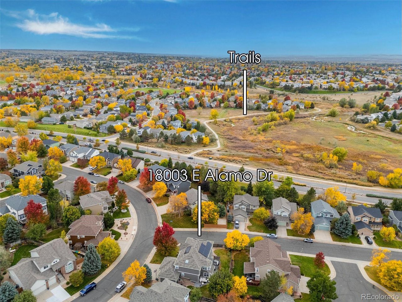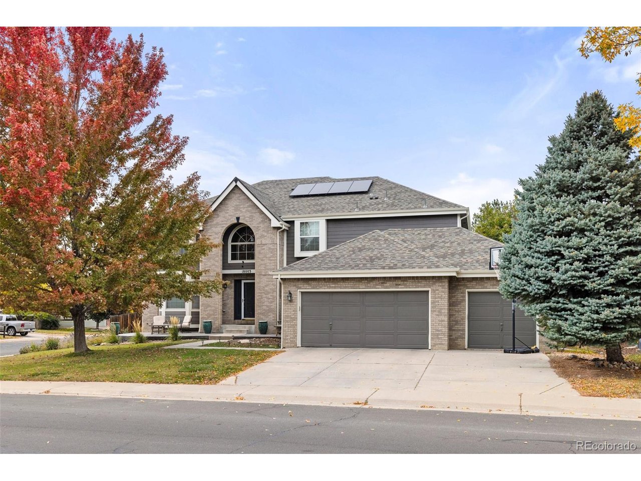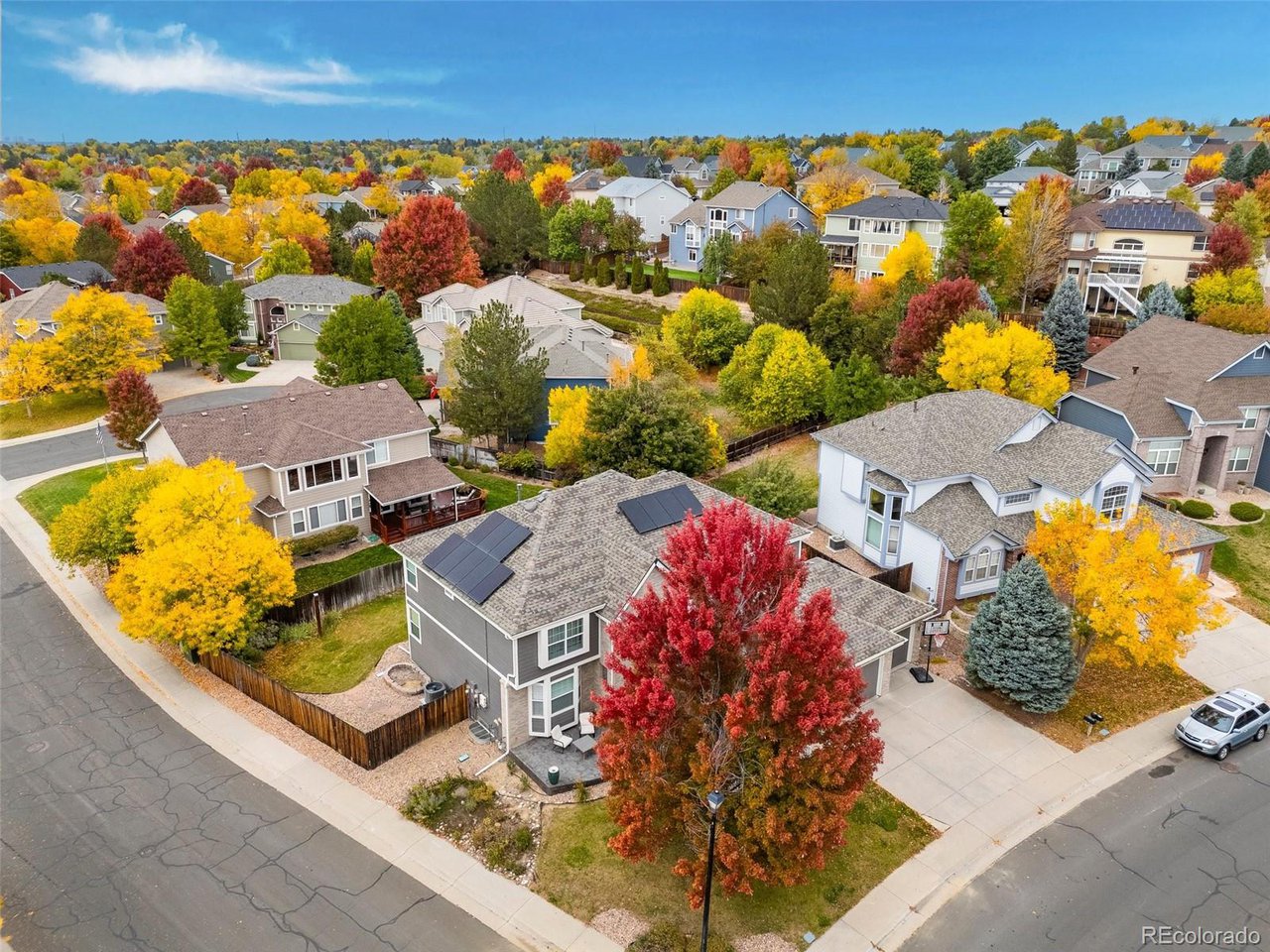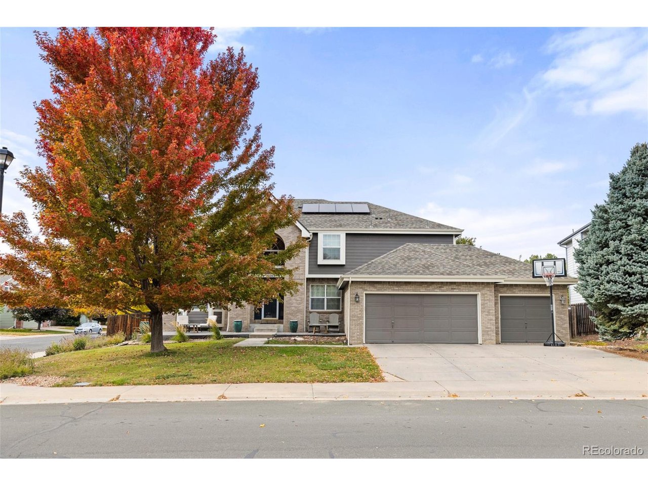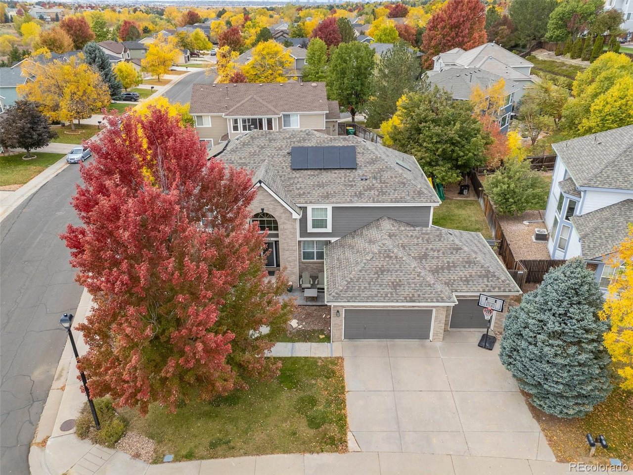 Highly desired area, located in Cherry Creek School District, this home is perfect for entertaining or simply relaxing. Corner .21 acre lot, 3 CAR OVERSIZED garage, 5 bed, 4 bath w main floor bedroom and shower. Updates throughout including brand new countertops in kitchens and baths. Hardwood floors, 2 story ceilings, shows light and bright. Neutral colors and upgraded finishes, flexible and functional floor plan. Formal dining plus eat space and open kitchen with true double ovens and gas cooktop. Family room with fireplace plus living/office/flex room. Main floor laundry and mud room. 4 additional bedrooms on the upper level including 2 with jack and jill full bath with double sinks, and 1 with ensuite 3/4 bath, plus the primary suite with sitting area and fireplace, five piece bath and walk in closet. Full unfinished basement. Brick frame exterior, NEW class IV shingle ROOF, NEW windows, NEW exterior paint, NEW extended front porch and large patio with pergola in back. Fully fenced yard, dog run and garden area. Exterior access door from garage. 2024 furnace and central air conditioning, plus whole house attic fan! Solar panels owned free and clear! Mature trees and an excellent community close to shopping, dining, recreation and more. Within minutes of Trails Recreation Center, the library, NEIGHBORHOOD POOL and parks. So much close by... Southlands Mall, Cherry Creek State Park, and all the schools... Grandview, Falcon Creek and Trails West. Some extras... SMART thermostat, video doorbell and security system included, TING FIBER internet.
