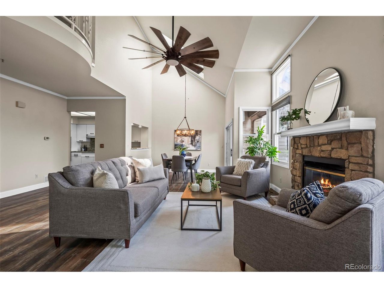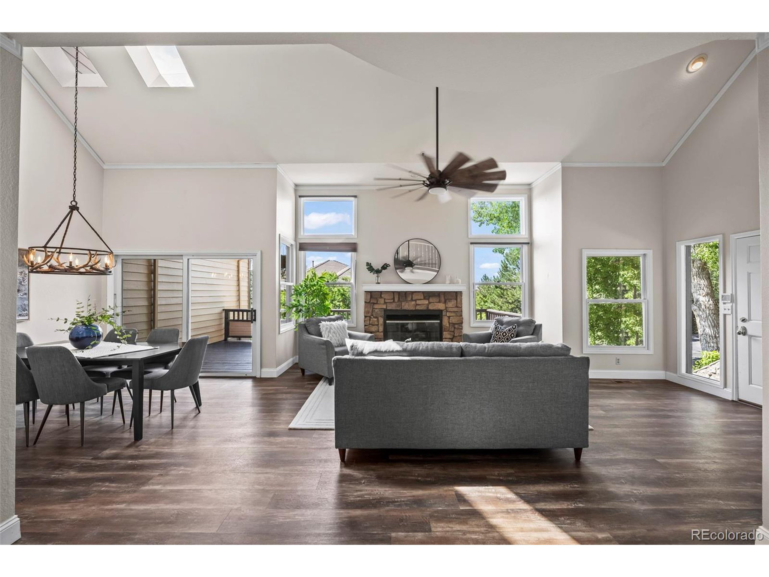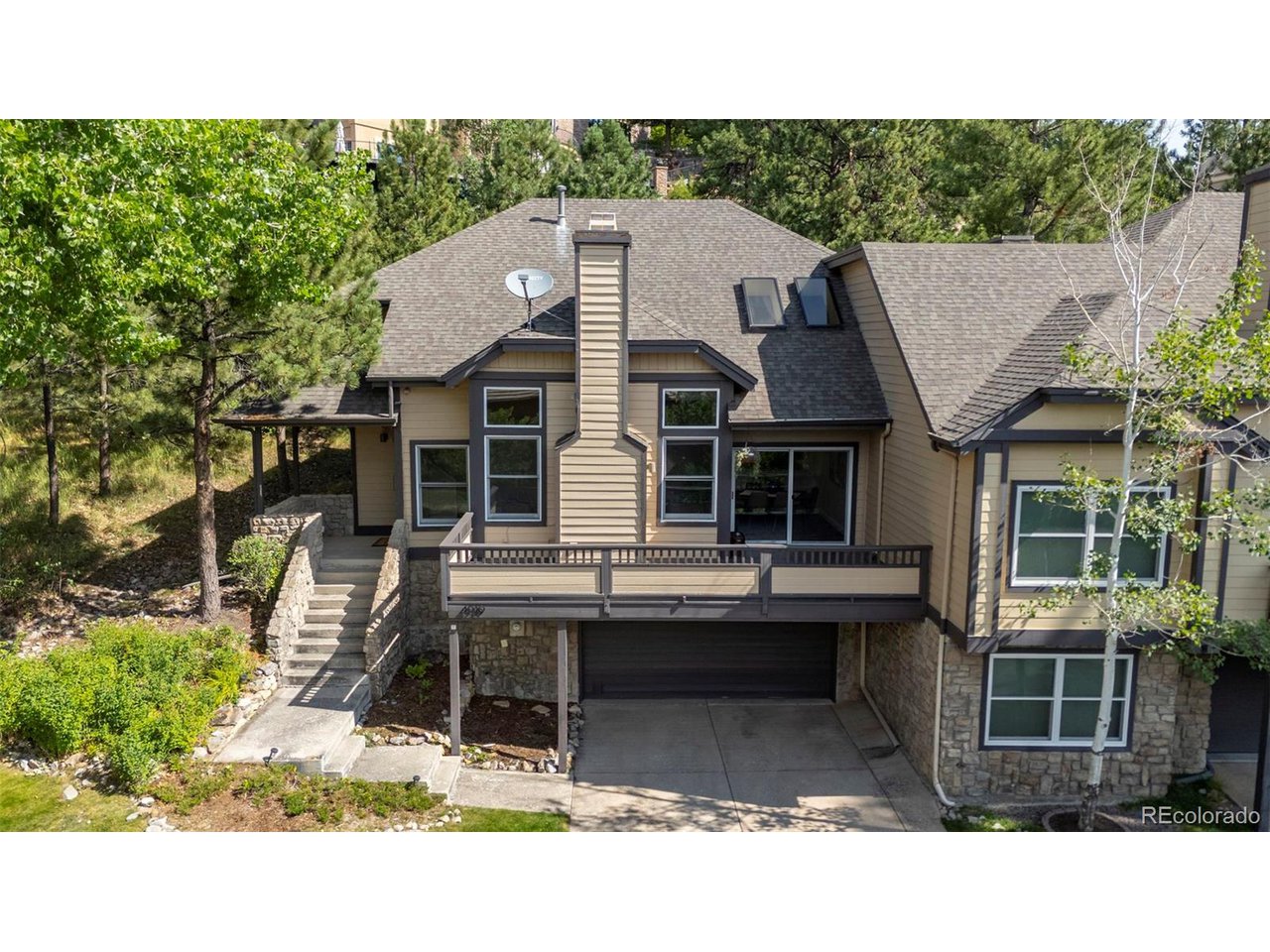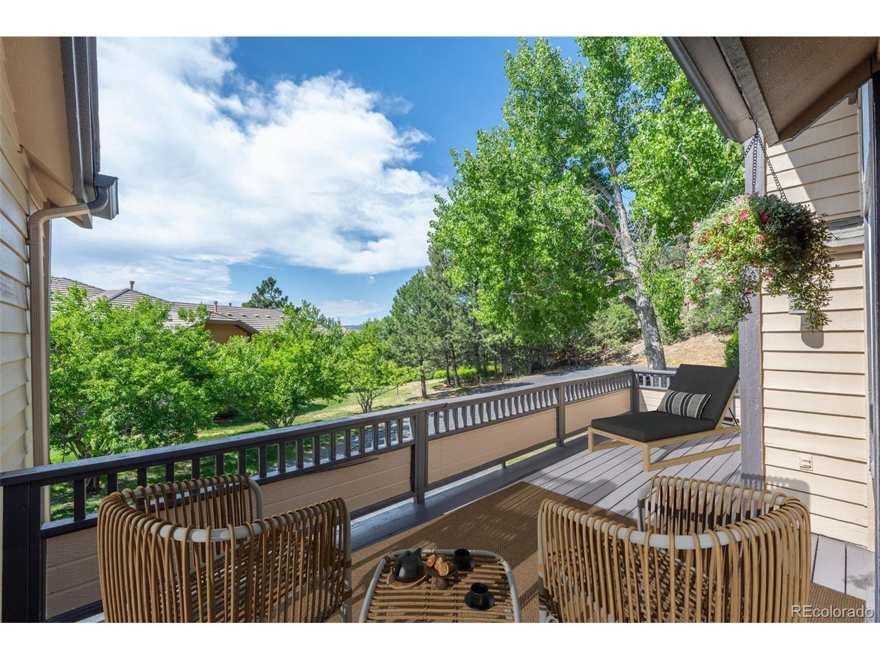 Tucked inside the gated and highly desirable Castle Pines Village, this beautifully updated condo offers a blend of comfort, style, and serenity. The open floor plan features vaulted ceilings and updated flooring throughout. A sunlit kitchen with granite counters and skylights flows into a charming breakfast nook and a dining room with a convenient serving bar. The living room-anchored by a gas fireplace-opens to a spacious deck perfect for entertaining or unwinding outdoors. A main-level bedroom offers flexible use as a guest room or home office. Upstairs, the expansive primary suite includes ample closet space, a luxurious five-piece bath, and a private balcony nestled among mature pines for added shade and tranquility. Enjoy resort-style amenities including 24/7 gated security, multiple pools (including an adults-only option), tennis and pickleball courts, a clubhouse, walking trails, scenic open space, and a picturesque pond with a waterfall. All just minutes from dining and shopping favorites like Miyo Cafe, Whole Foods, Cuba Cuba, and the Castle Rock Outlets. This peaceful retreat won't last-schedule your showing today!