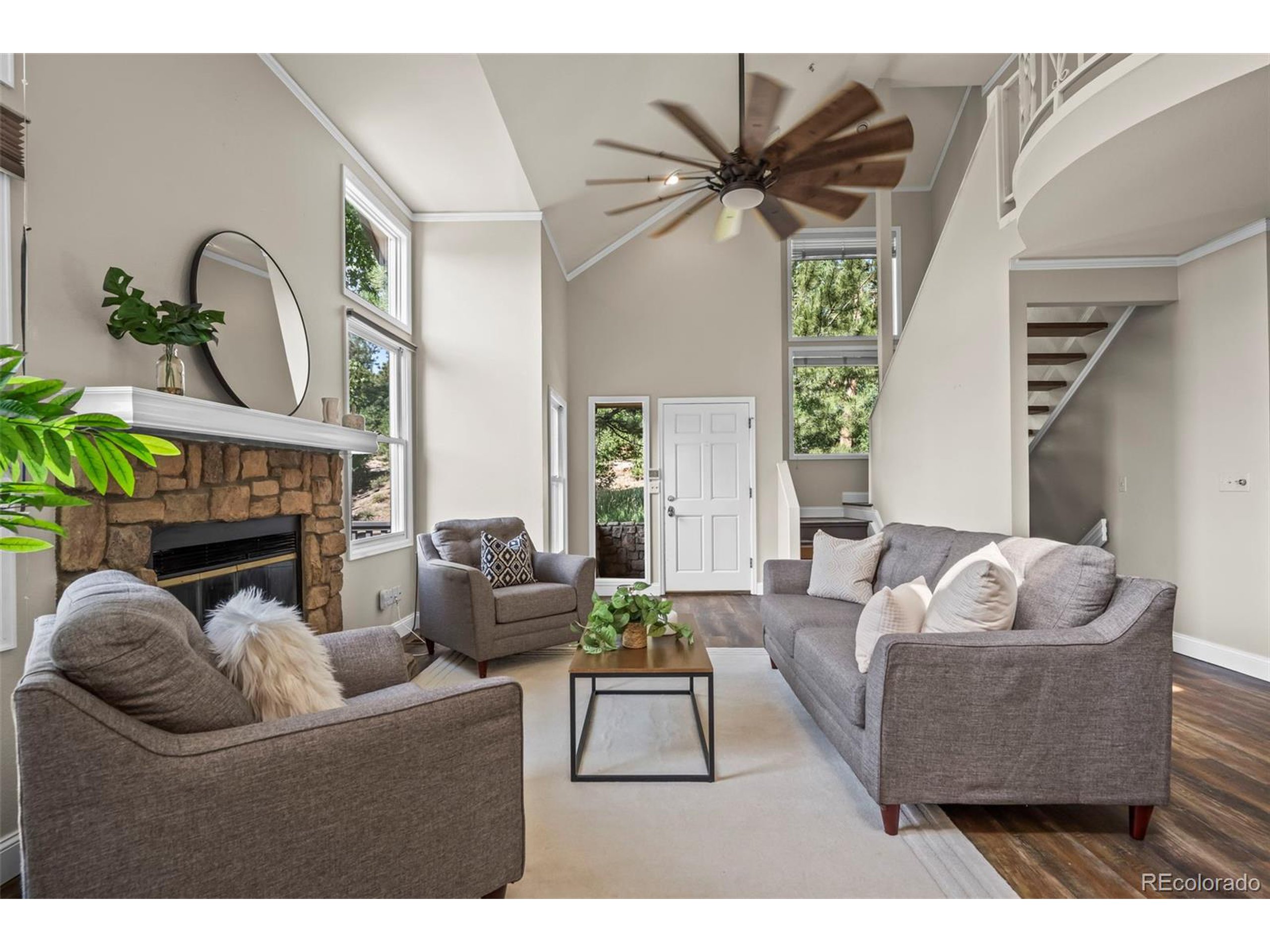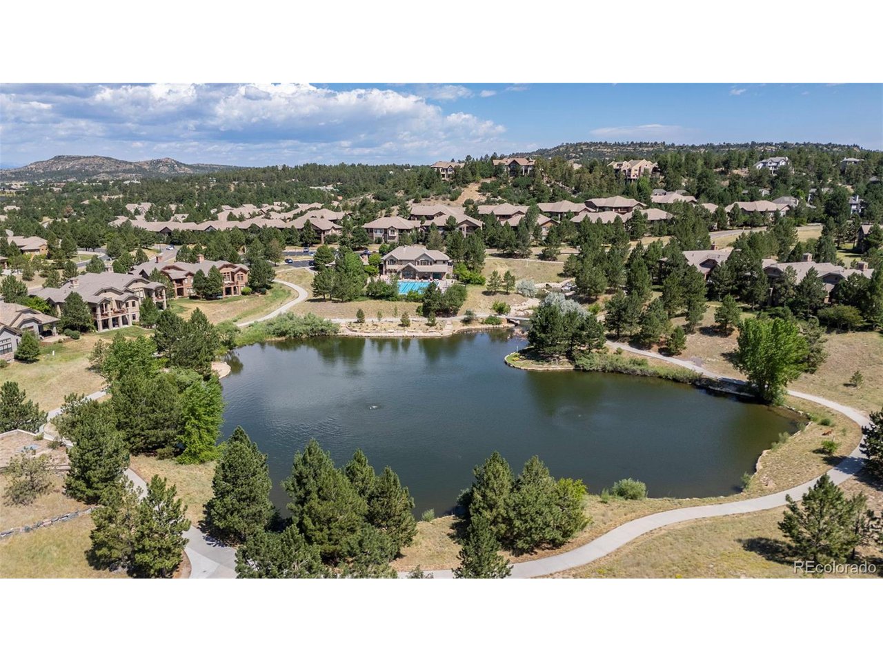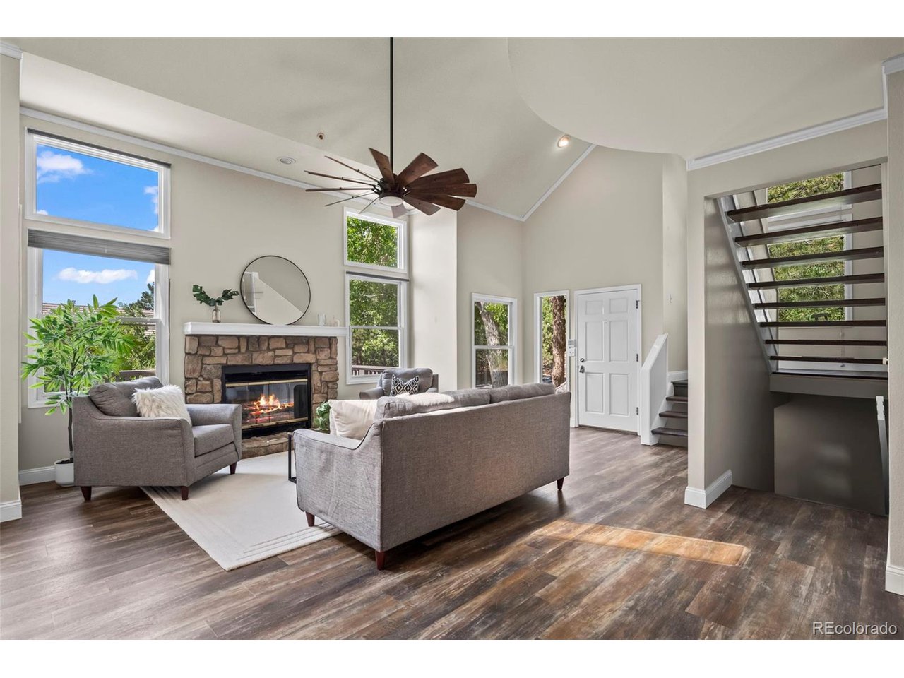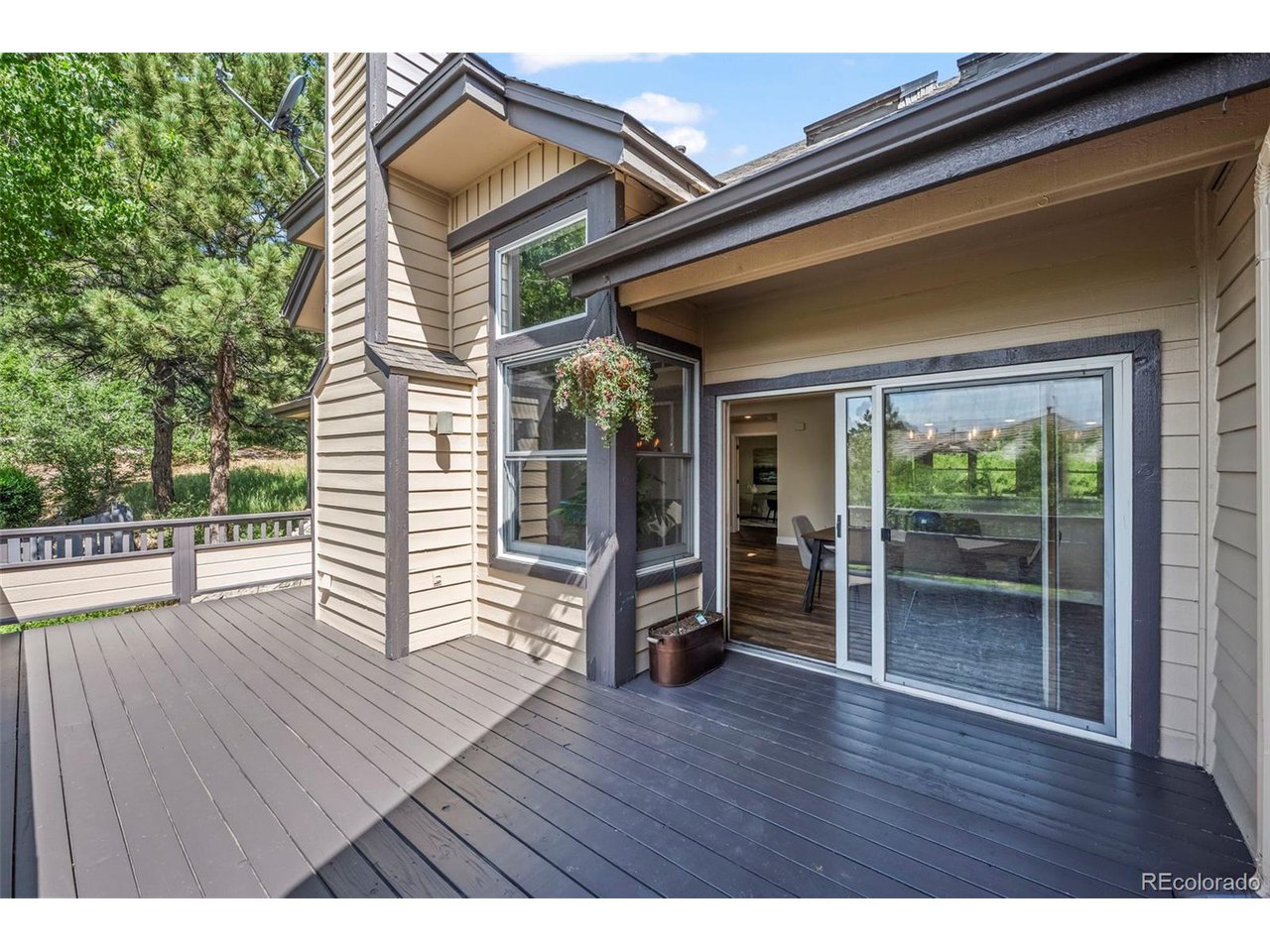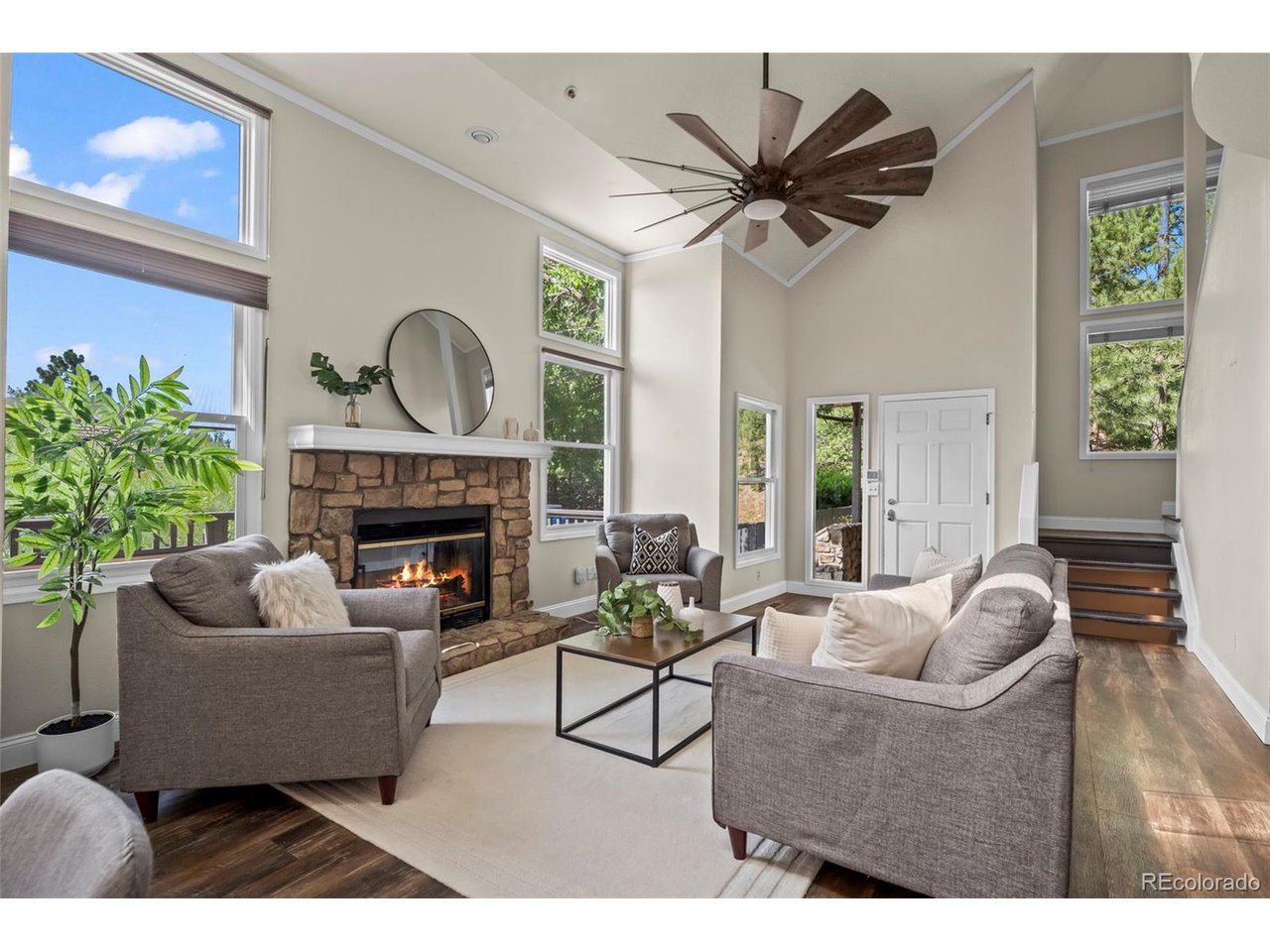 Tucked inside the gated and highly desirable Castle Pines Village, this beautifully updated condo offers a blend of comfort, style, and serenity. The open floor plan features vaulted ceilings and updated flooring throughout. A sunlit kitchen with granite counters and skylights flows into a charming breakfast nook and a dining room with a convenient serving bar. The living room-anchored by a gas fireplace-opens to a spacious deck perfect for entertaining or unwinding outdoors. A main-level bedroom offers flexible use as a guest room or home office. Upstairs, the expansive primary suite includes ample closet space, a luxurious five-piece bath, and a private balcony nestled among mature pines for added shade and tranquility. Enjoy resort-style amenities including 24/7 gated security, multiple pools (including an adults-only option), tennis and pickleball courts, a clubhouse, walking trails, scenic open space, and a picturesque pond with a waterfall. All just minutes from dining and shopping favorites like Miyo Cafe, Whole Foods, Cuba Cuba, and the Castle Rock Outlets. This peaceful retreat won't last-schedule your showing today!