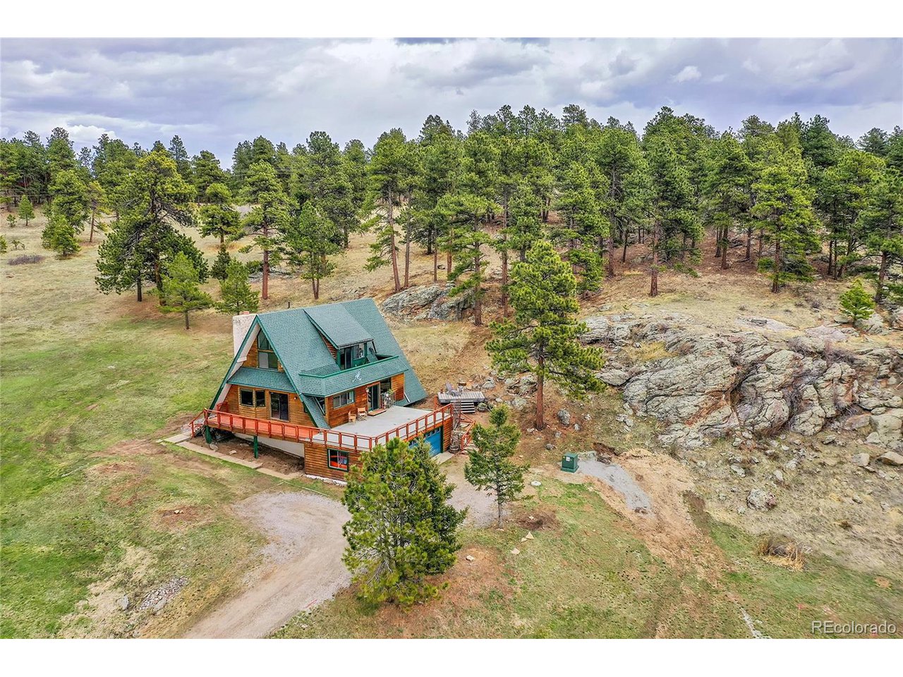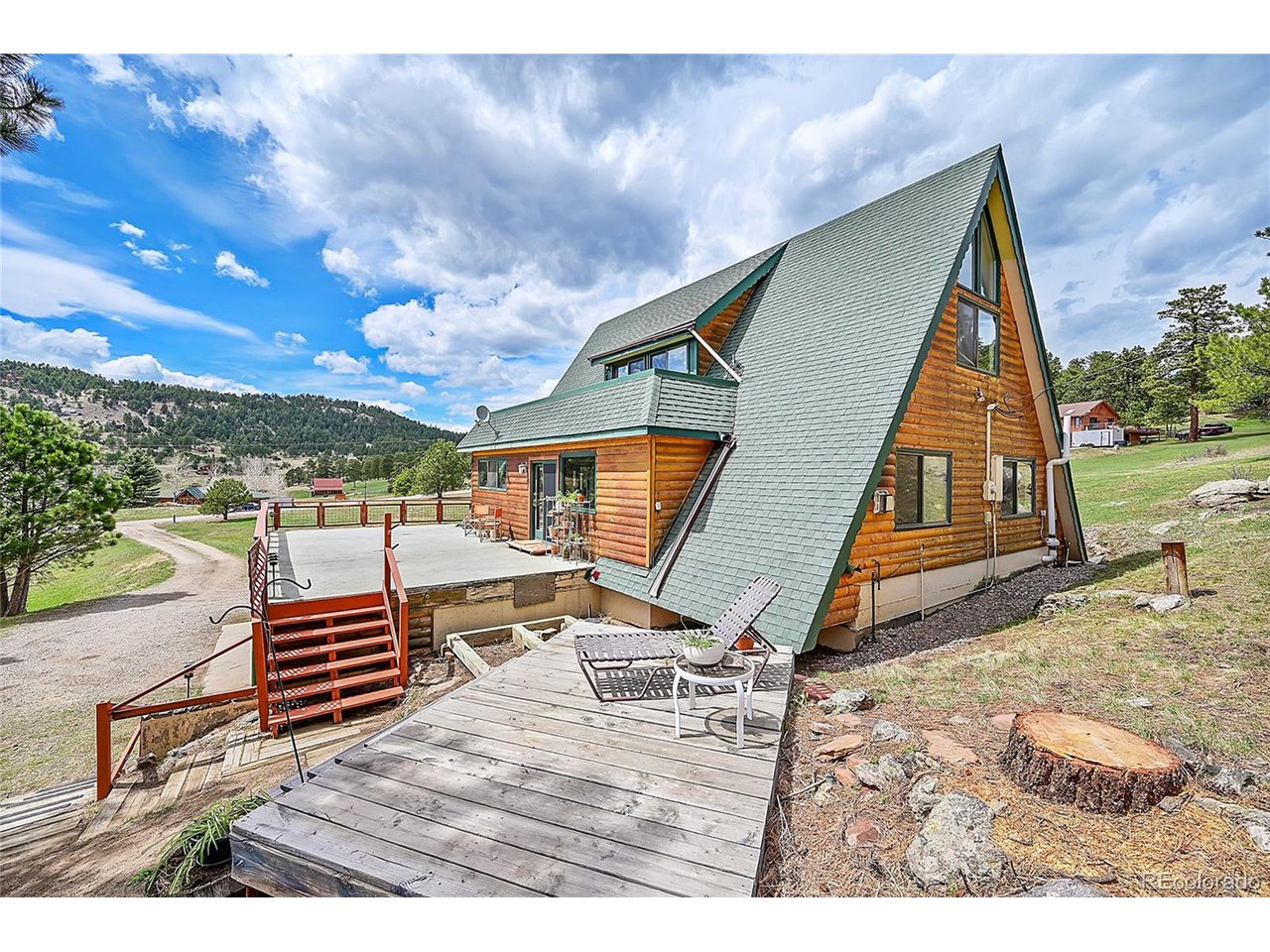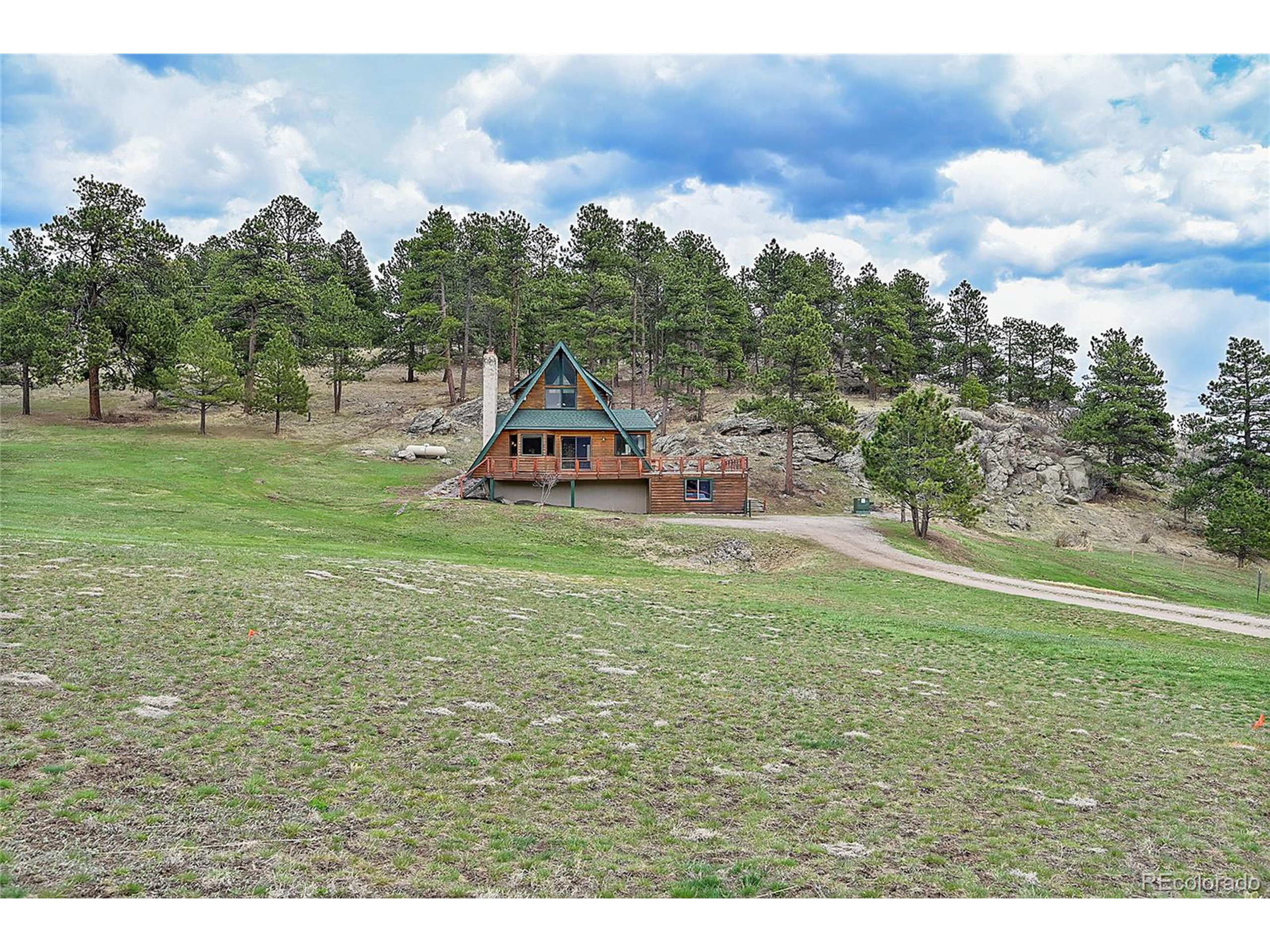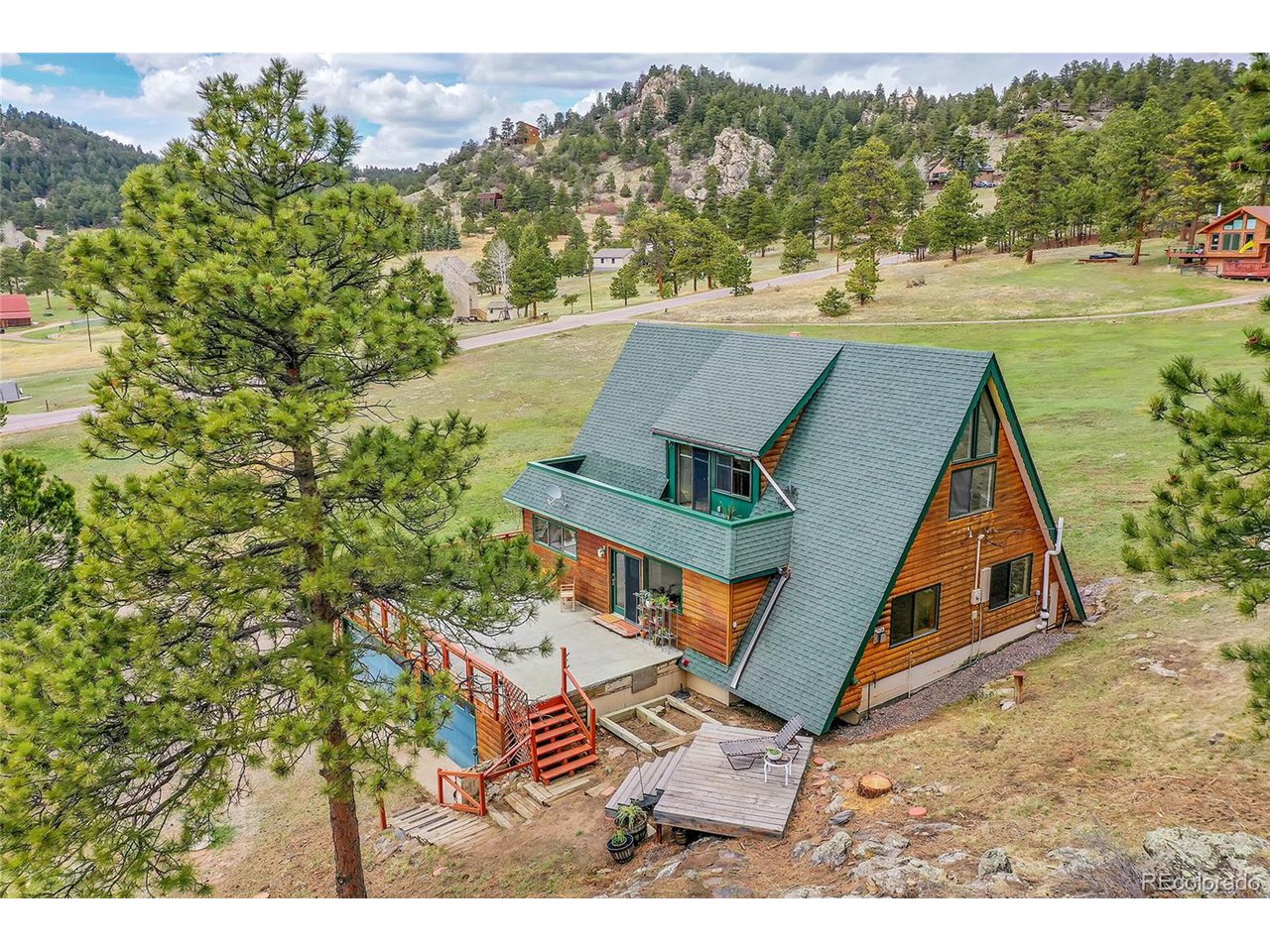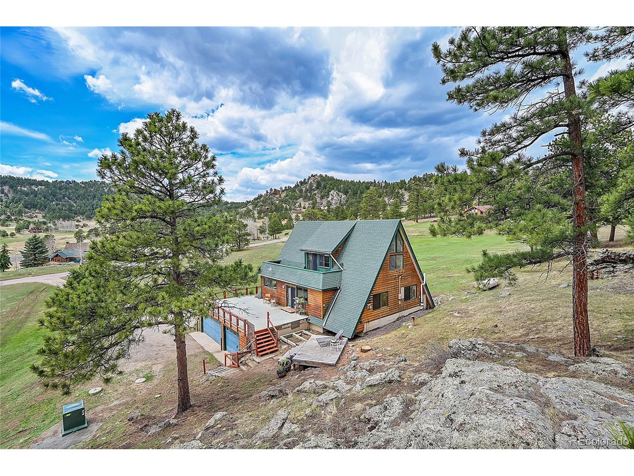Nestled on a gorgeous 2.7 acres with usable flat land and terrific views, you will love this charming A frame. Approach the house on a flat driveway with plenty of parking and enjoy the large 3 car garage and with an additional workshop area. Inside, you will find a remodeled contemporary kitchen with large windows that takes advantage of the views. There is abundant sunshine and light throughout. The rustic hardwood floors and interior wood provide a cozy feel. The main floor has an open floor plan featuring the living room with gas fireplace and entrance to the large deck. You will also find a bedroom, bath and bonus room, currently used as a dining room with an additional gas stove. Upstairs find the primary retreat with a private balcony and a loft area. The lower level has a 3rd non-conforming bedroom and additional bonus space. Storage abounds! The expansive deck makes for great outdoor living with southern exposure, with lovely views and plenty of space. The 2.7 acre lot is just beautiful with rock outcroppings, big views, in addition to flat, very usable land. The property was professionally mitigated. Great internet too. This delightful neighborhood includes amenities such as a 20+ acre area with a community pond, tennis/pickle ball courts, play area, volleyball court and rentable barn for events. Lots of community gatherings too. It's just 9 minutes to Hwy 285 for a quick trip to Denver, and just 14 minutes to downtown Evergreen. Come home to delightful living!