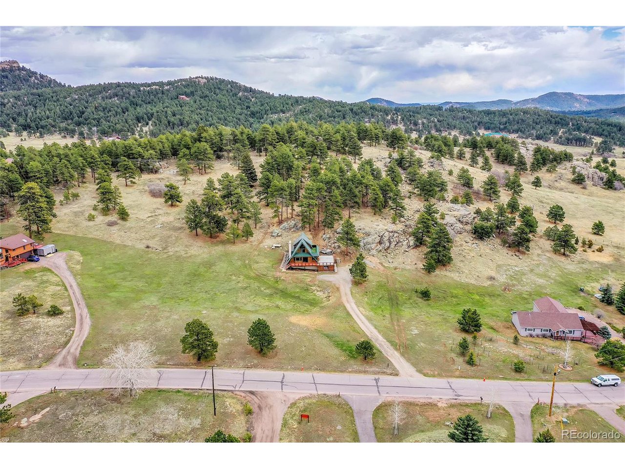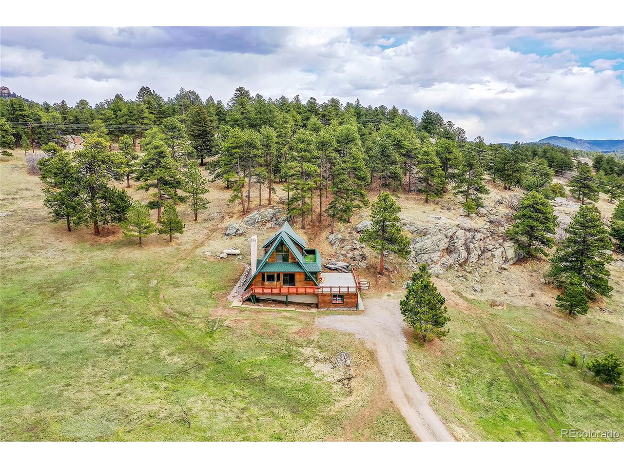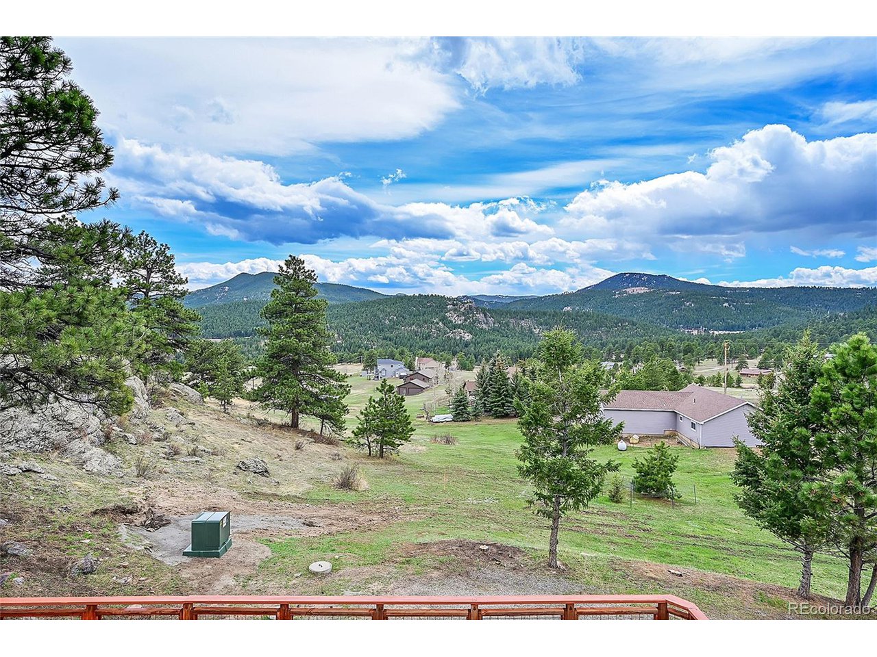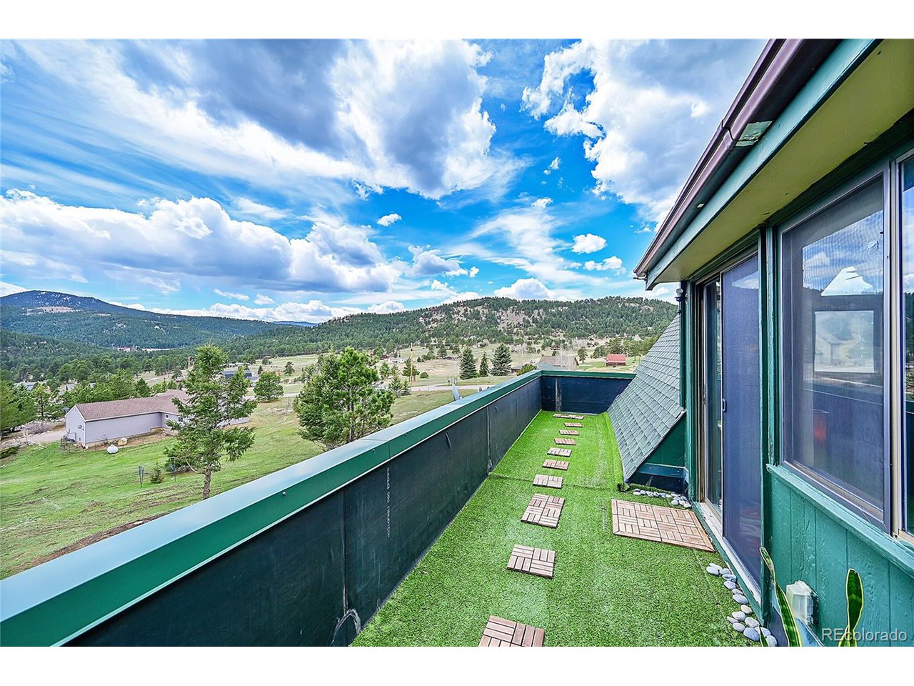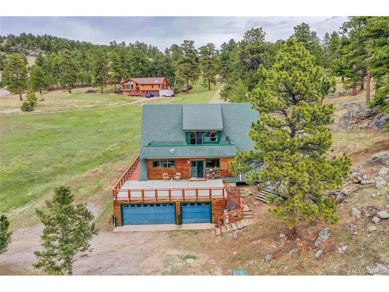 Nestled on a gorgeous 2.7 acres with usable flat land and terrific views, you will love this charming A frame. Approach the house on a flat driveway with plenty of parking and enjoy the large 3 car garage and with an additional workshop area. Inside, you will find a remodeled contemporary kitchen with large windows that takes advantage of the views. There is abundant sunshine and light throughout. The rustic hardwood floors and interior wood provide a cozy feel. The main floor has an open floor plan featuring the living room with gas fireplace and entrance to the large deck. You will also find a bedroom, bath and bonus room, currently used as a dining room with an additional gas stove. Upstairs find the primary retreat with a private balcony and a loft area. The lower level has a 3rd non-conforming bedroom and additional bonus space. Storage abounds! The expansive deck makes for great outdoor living with southern exposure, with lovely views and plenty of space. The 2.7 acre lot is just beautiful with rock outcroppings, big views, in addition to flat, very usable land. The property was professionally mitigated. Great internet too. This delightful neighborhood includes amenities such as a 20+ acre area with a community pond, tennis/pickle ball courts, play area, volleyball court and rentable barn for events. Lots of community gatherings too. It's just 9 minutes to Hwy 285 for a quick trip to Denver, and just 14 minutes to downtown Evergreen. Come home to delightful living!