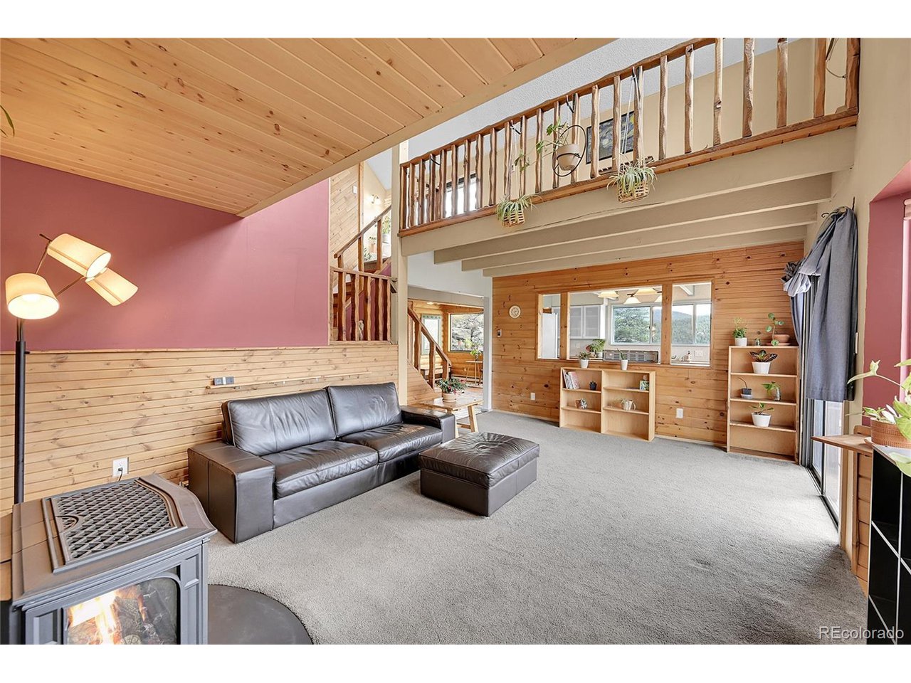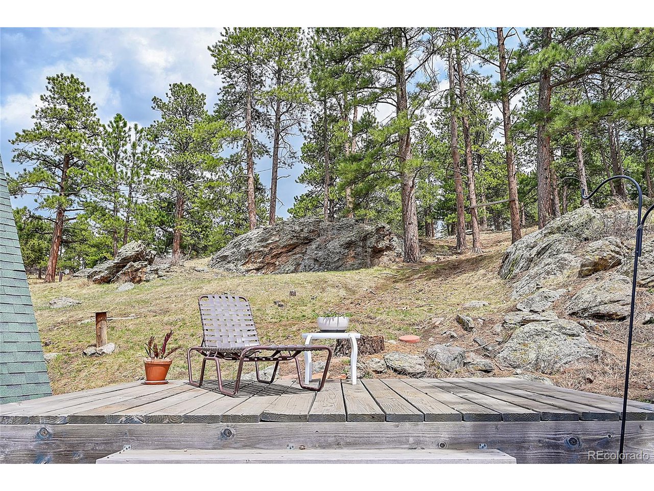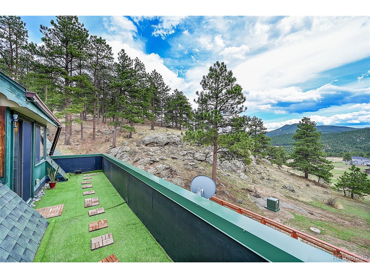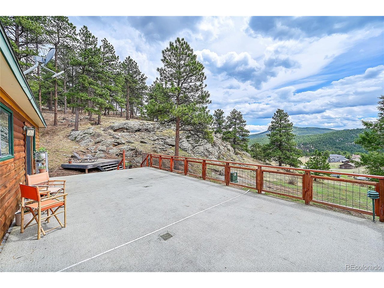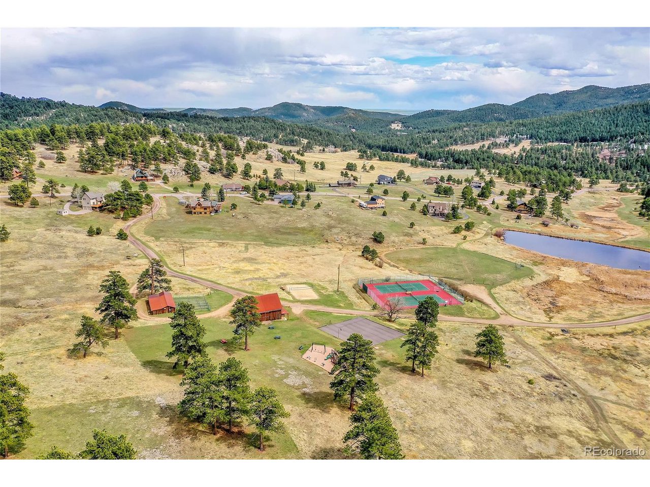 Nestled on a gorgeous 2.7 acres with usable flat land and terrific views, you will love this charming A frame. Approach the house on a flat driveway with plenty of parking and enjoy the large 3 car garage and with an additional workshop area. Inside, you will find a remodeled contemporary kitchen with large windows that takes advantage of the views. There is abundant sunshine and light throughout. The rustic hardwood floors and interior wood provide a cozy feel. The main floor has an open floor plan featuring the living room with gas fireplace and entrance to the large deck. You will also find a bedroom, bath and bonus room, currently used as a dining room with an additional gas stove. Upstairs find the primary retreat with a private balcony and a loft area. The lower level has a 3rd non-conforming bedroom and additional bonus space. Storage abounds! The expansive deck makes for great outdoor living with southern exposure, with lovely views and plenty of space. The 2.7 acre lot is just beautiful with rock outcroppings, big views, in addition to flat, very usable land. The property was professionally mitigated. Great internet too. This delightful neighborhood includes amenities such as a 20+ acre area with a community pond, tennis/pickle ball courts, play area, volleyball court and rentable barn for events. Lots of community gatherings too. It's just 9 minutes to Hwy 285 for a quick trip to Denver, and just 14 minutes to downtown Evergreen. Come home to delightful living!