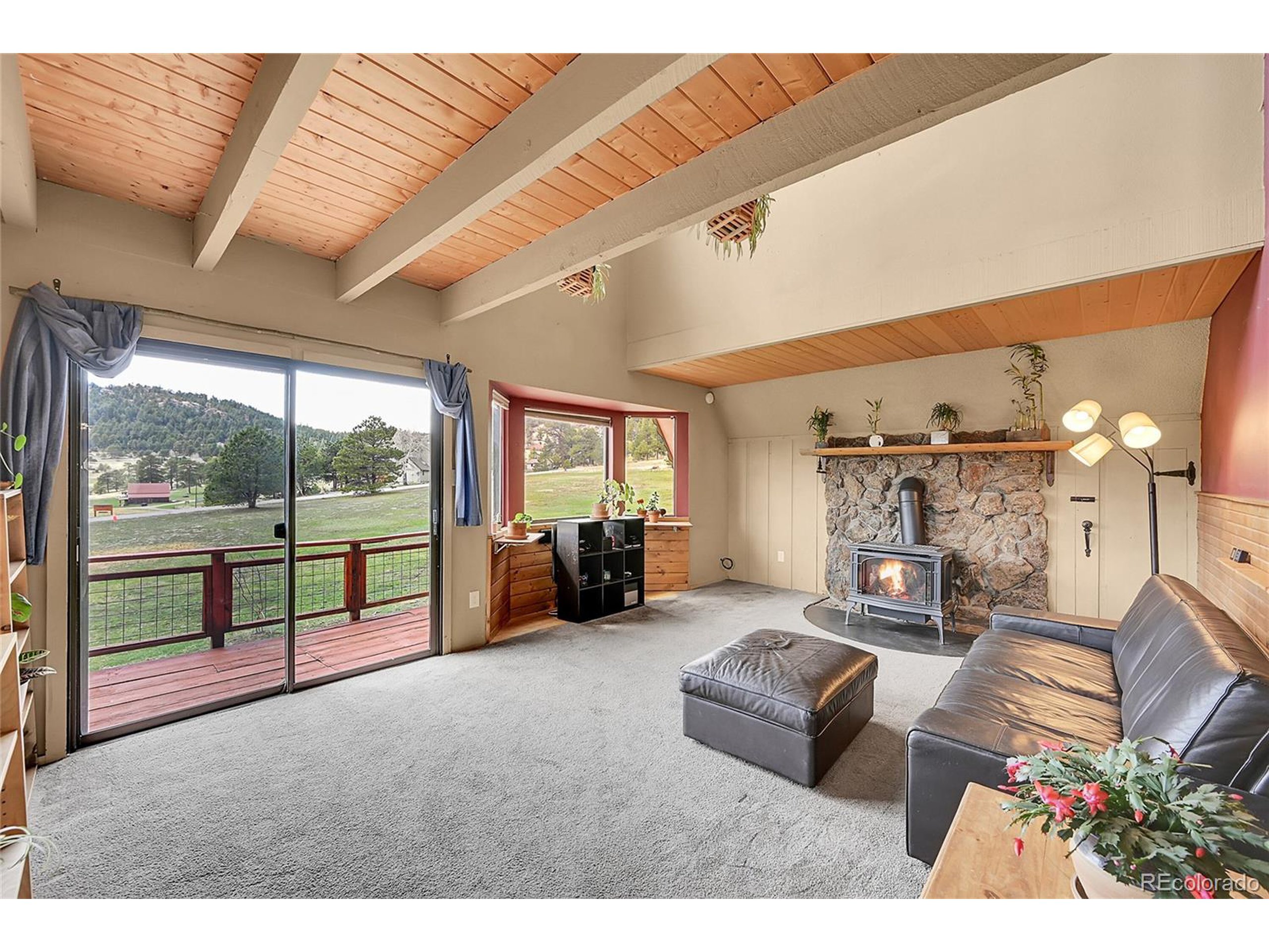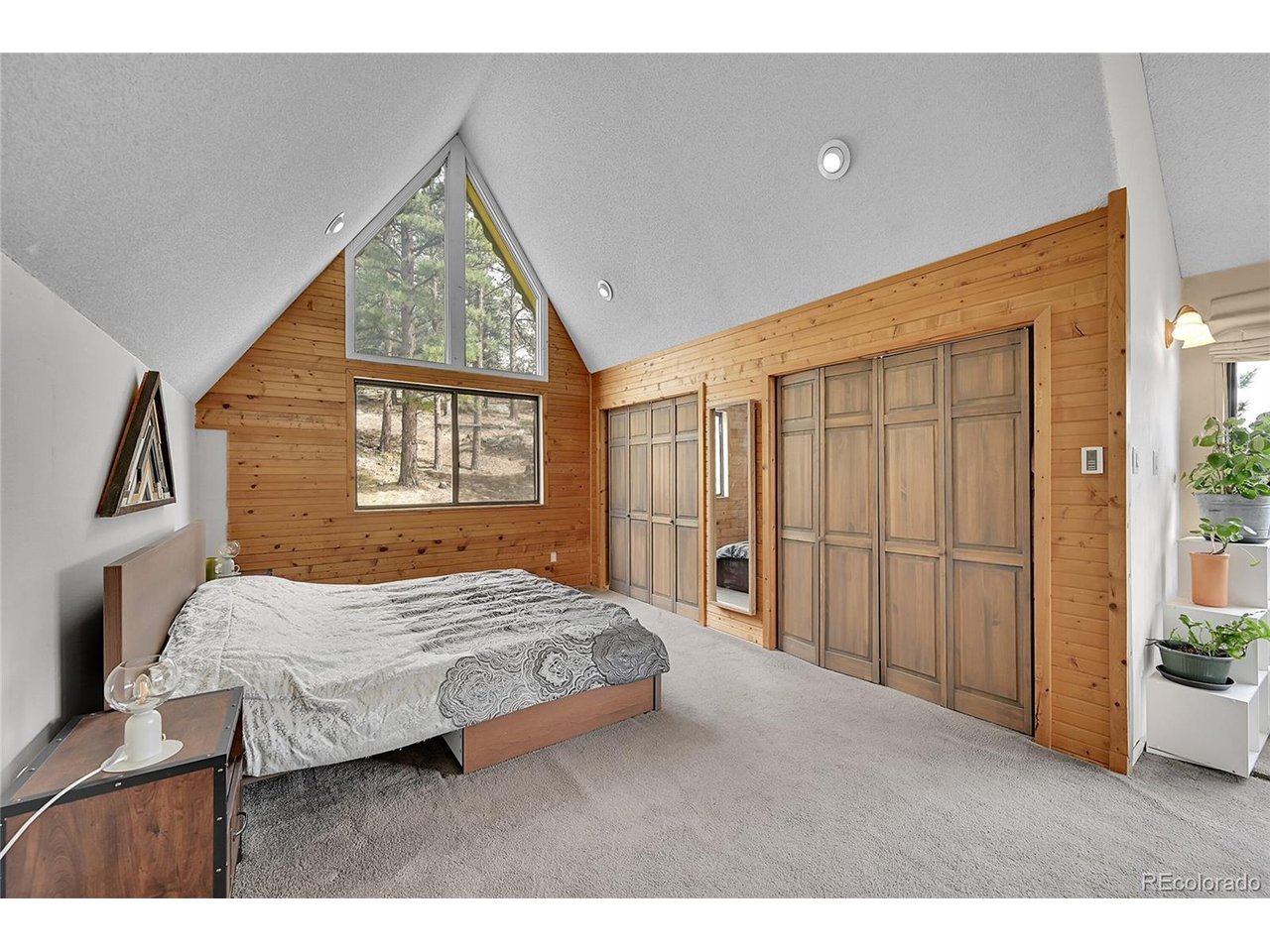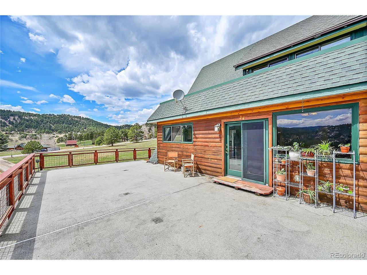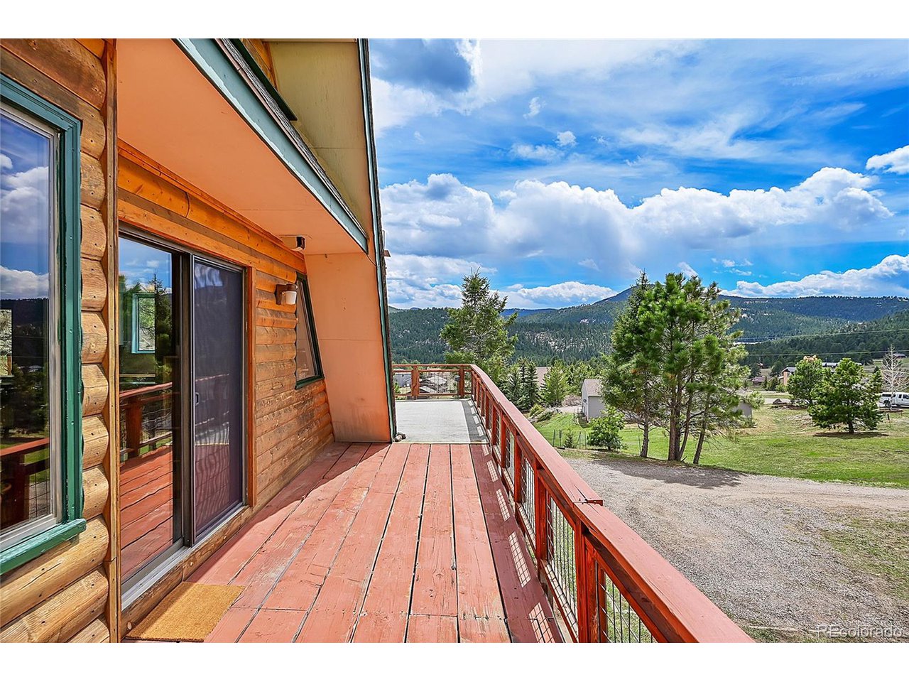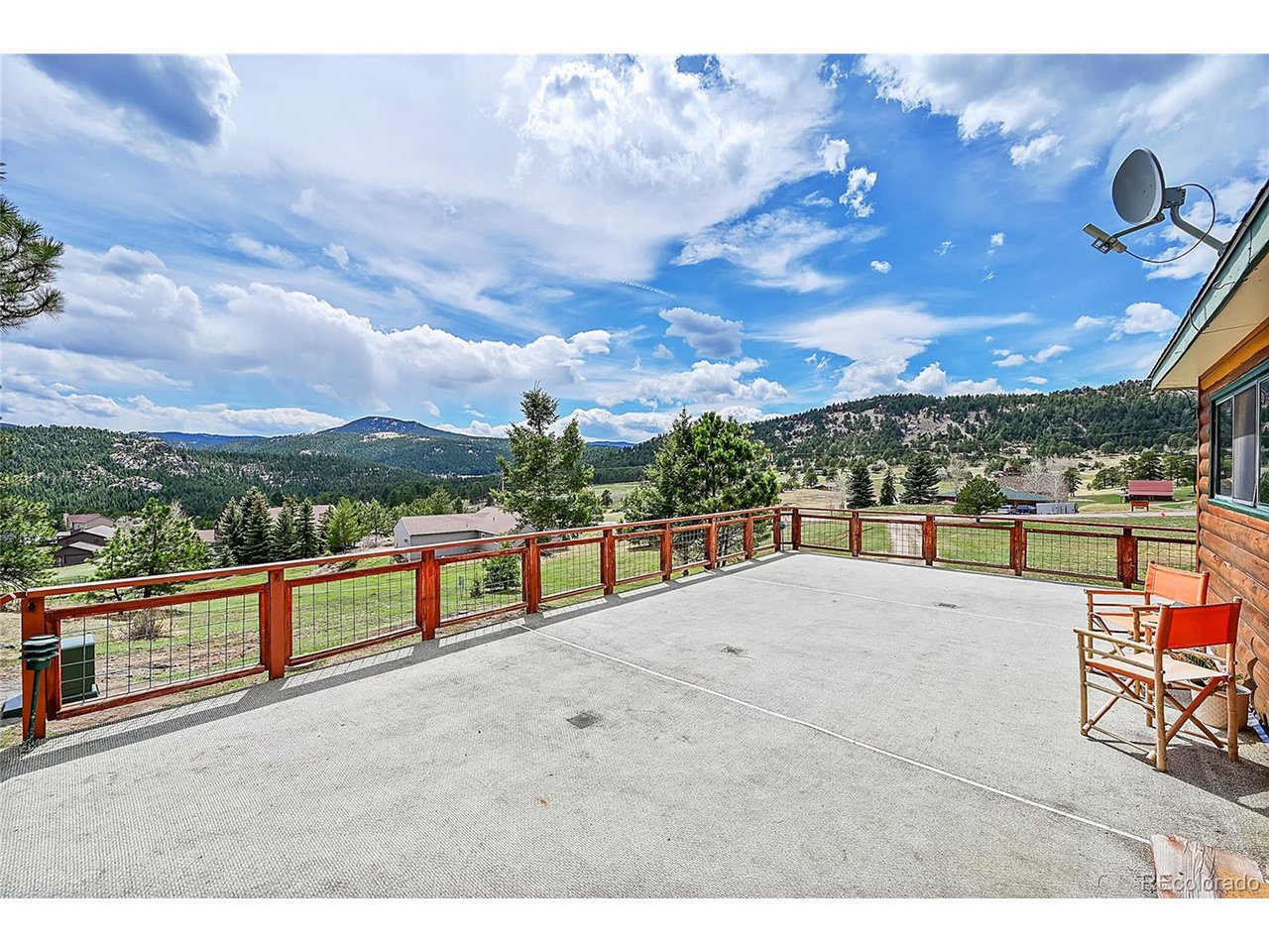 Nestled on a gorgeous 2.7 acres with usable flat land and terrific views, you will love this charming A frame. Approach the house on a flat driveway with plenty of parking and enjoy the large 3 car garage and with an additional workshop area. Inside, you will find a remodeled contemporary kitchen with large windows that takes advantage of the views. There is abundant sunshine and light throughout. The rustic hardwood floors and interior wood provide a cozy feel. The main floor has an open floor plan featuring the living room with gas fireplace and entrance to the large deck. You will also find a bedroom, bath and bonus room, currently used as a dining room with an additional gas stove. Upstairs find the primary retreat with a private balcony and a loft area. The lower level has a 3rd non-conforming bedroom and additional bonus space. Storage abounds! The expansive deck makes for great outdoor living with southern exposure, with lovely views and plenty of space. The 2.7 acre lot is just beautiful with rock outcroppings, big views, in addition to flat, very usable land. The property was professionally mitigated. Great internet too. This delightful neighborhood includes amenities such as a 20+ acre area with a community pond, tennis/pickle ball courts, play area, volleyball court and rentable barn for events. Lots of community gatherings too. It's just 9 minutes to Hwy 285 for a quick trip to Denver, and just 14 minutes to downtown Evergreen. Come home to delightful living!
