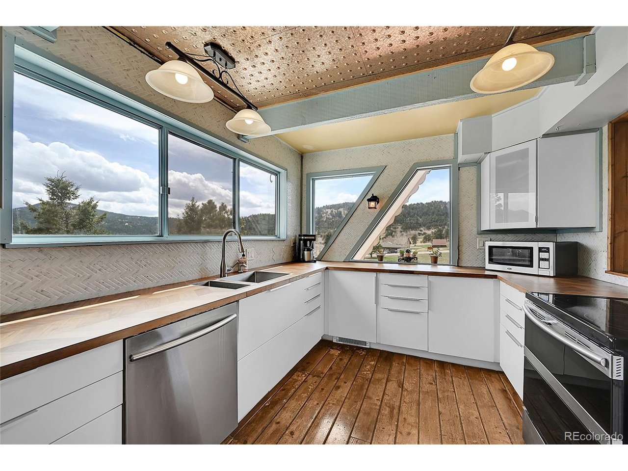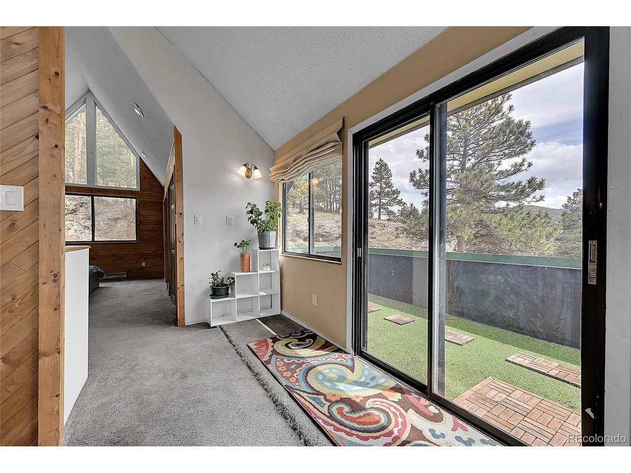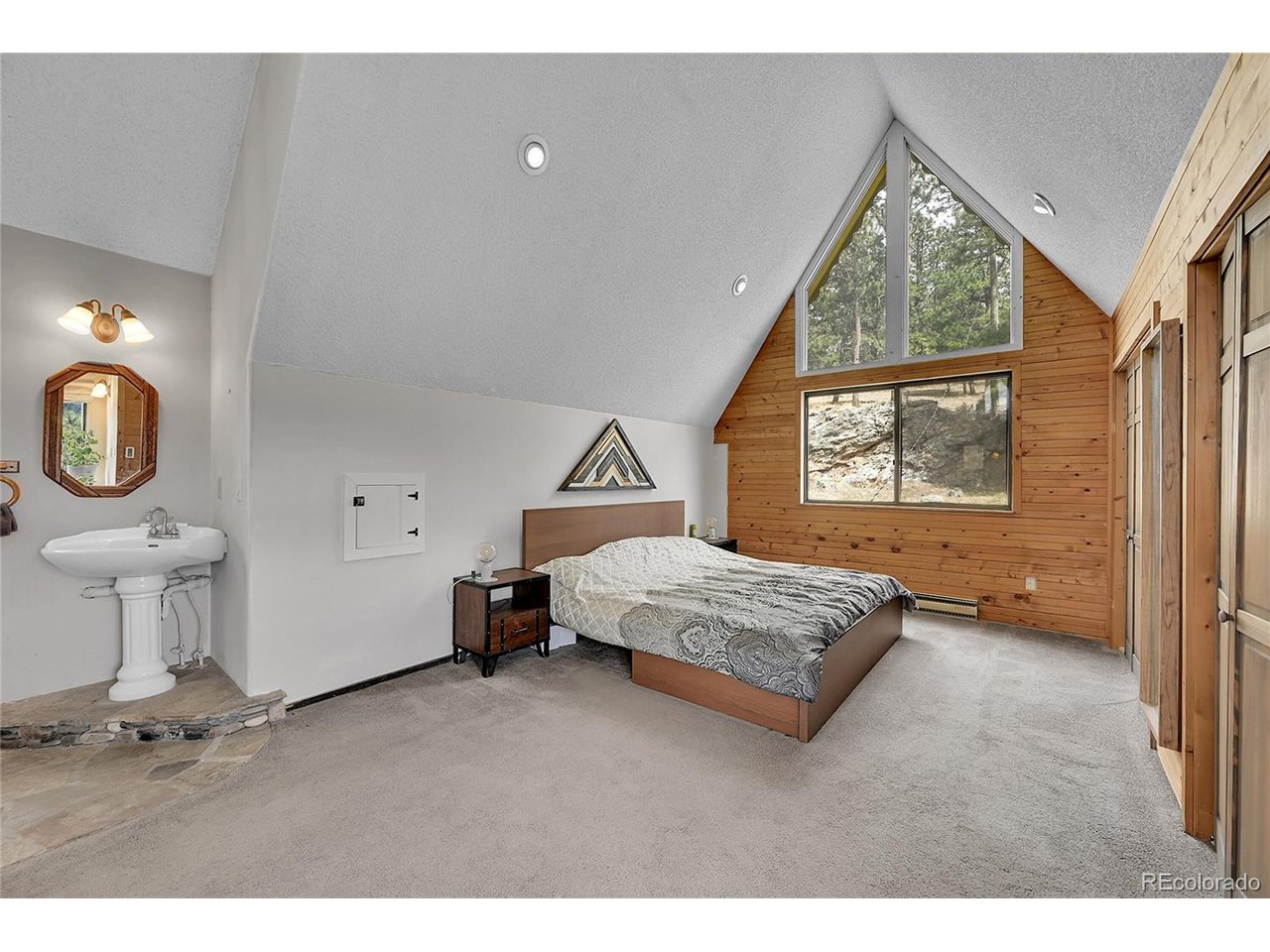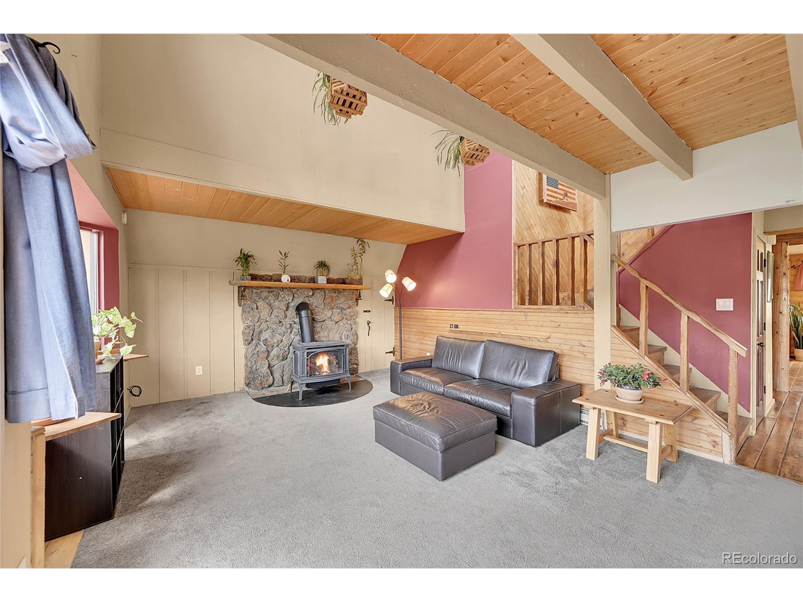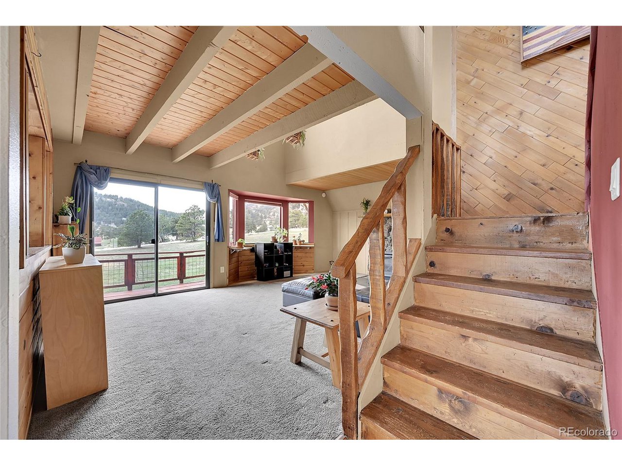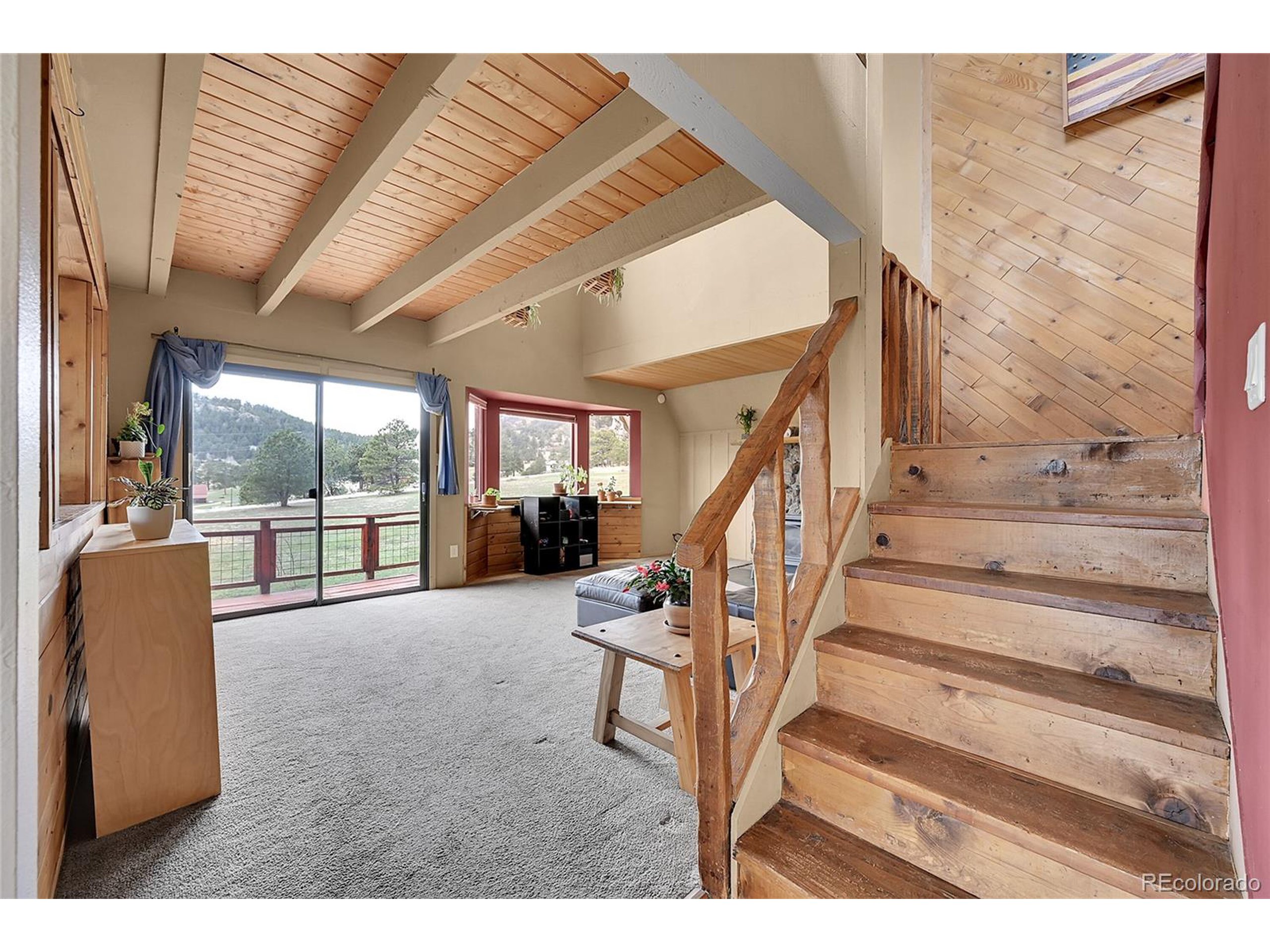 Nestled on a gorgeous 2.7 acres with usable flat land and terrific views, you will love this charming A frame. Approach the house on a flat driveway with plenty of parking and enjoy the large 3 car garage and with an additional workshop area. Inside, you will find a remodeled contemporary kitchen with large windows that takes advantage of the views. There is abundant sunshine and light throughout. The rustic hardwood floors and interior wood provide a cozy feel. The main floor has an open floor plan featuring the living room with gas fireplace and entrance to the large deck. You will also find a bedroom, bath and bonus room, currently used as a dining room with an additional gas stove. Upstairs find the primary retreat with a private balcony and a loft area. The lower level has a 3rd non-conforming bedroom and additional bonus space. Storage abounds! The expansive deck makes for great outdoor living with southern exposure, with lovely views and plenty of space. The 2.7 acre lot is just beautiful with rock outcroppings, big views, in addition to flat, very usable land. The property was professionally mitigated. Great internet too. This delightful neighborhood includes amenities such as a 20+ acre area with a community pond, tennis/pickle ball courts, play area, volleyball court and rentable barn for events. Lots of community gatherings too. It's just 9 minutes to Hwy 285 for a quick trip to Denver, and just 14 minutes to downtown Evergreen. Come home to delightful living!
