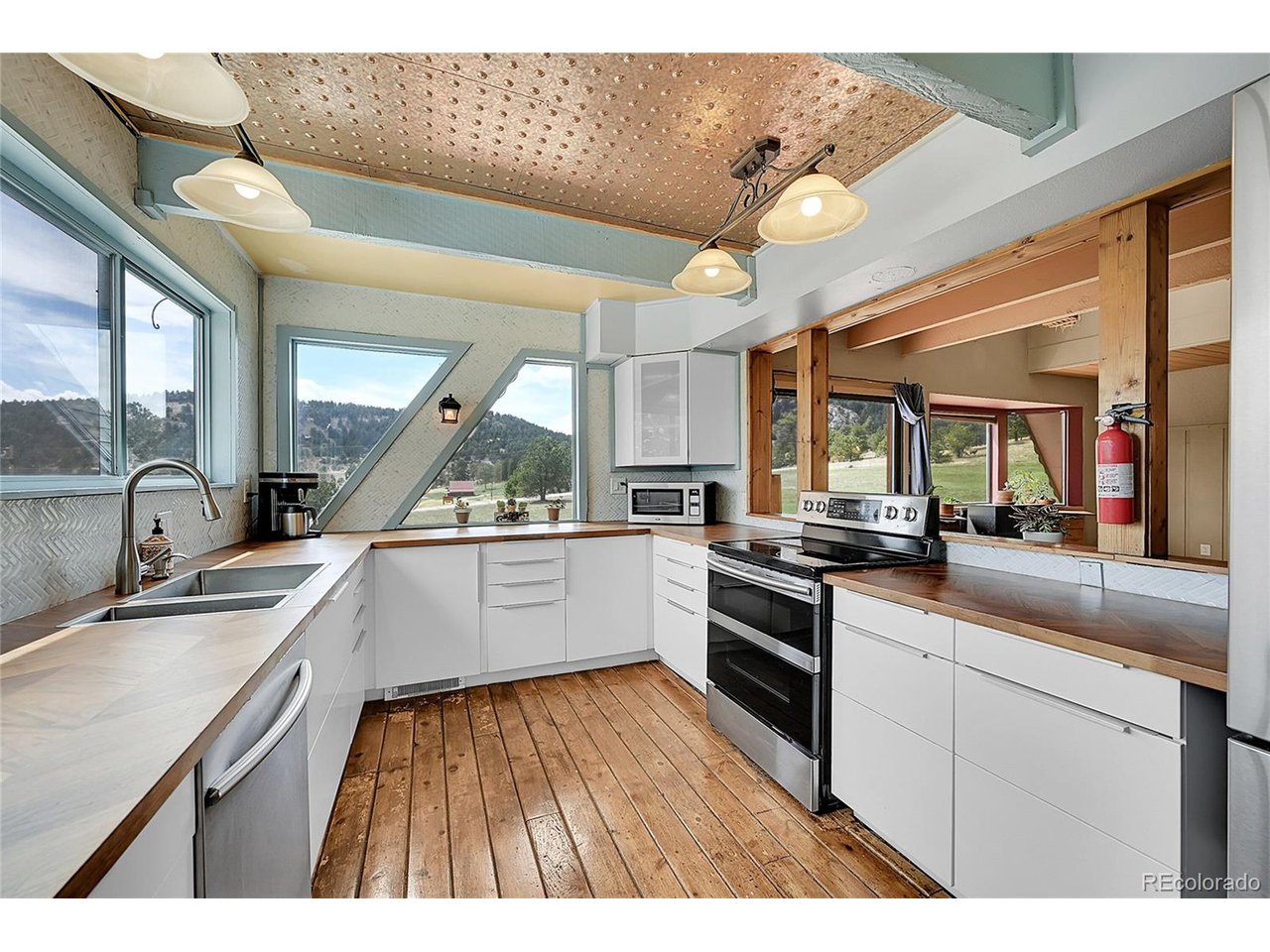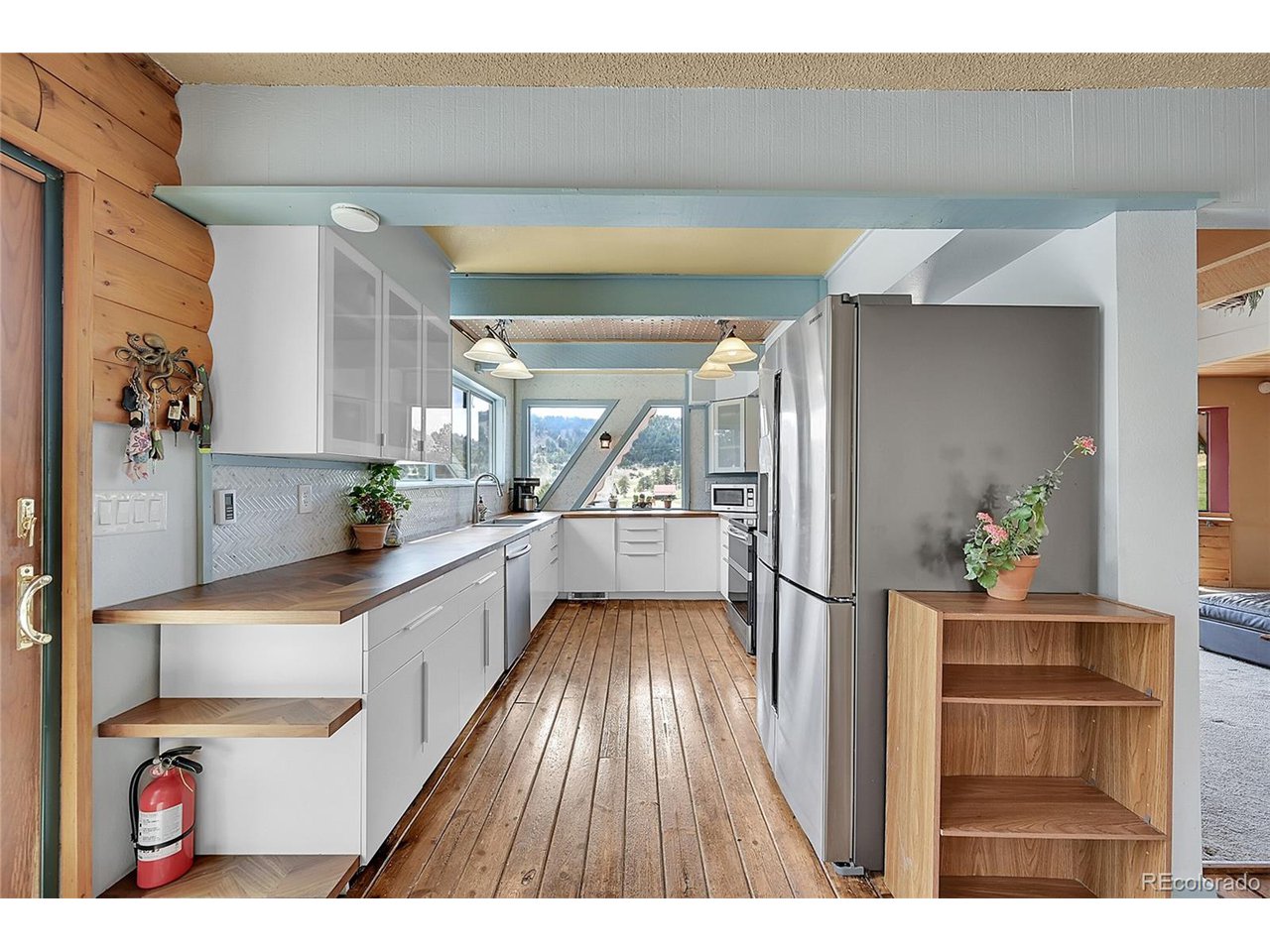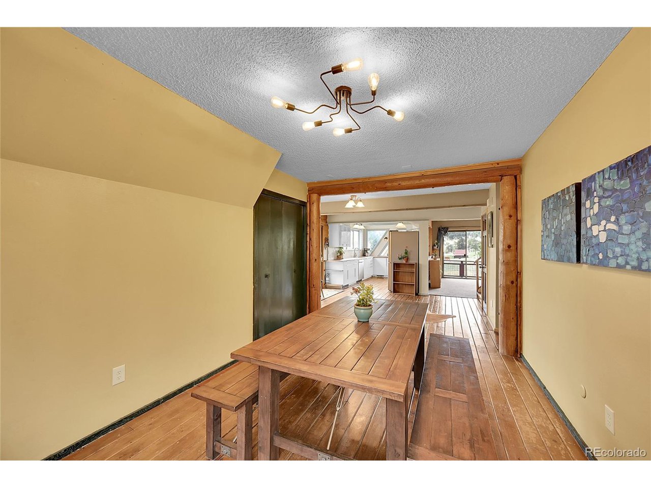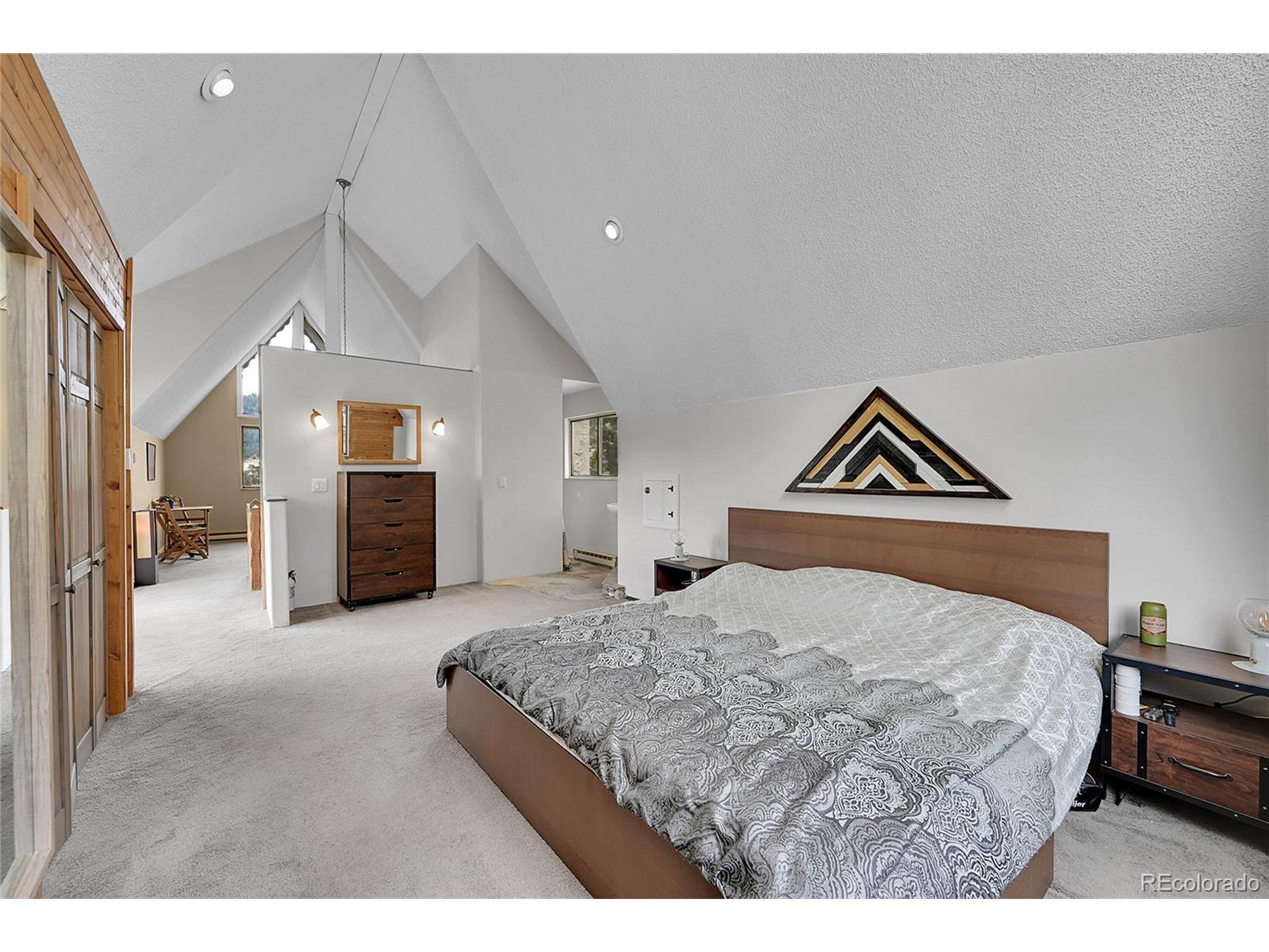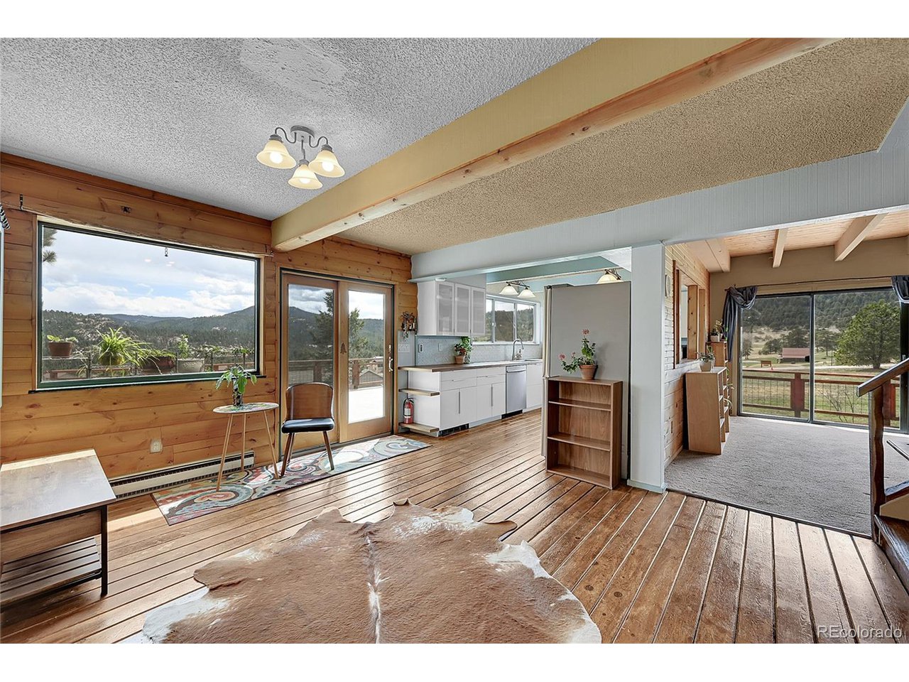 Nestled on a gorgeous 2.7 acres with usable flat land and terrific views, you will love this charming A frame. Approach the house on a flat driveway with plenty of parking and enjoy the large 3 car garage and with an additional workshop area. Inside, you will find a remodeled contemporary kitchen with large windows that takes advantage of the views. There is abundant sunshine and light throughout. The rustic hardwood floors and interior wood provide a cozy feel. The main floor has an open floor plan featuring the living room with gas fireplace and entrance to the large deck. You will also find a bedroom, bath and bonus room, currently used as a dining room with an additional gas stove. Upstairs find the primary retreat with a private balcony and a loft area. The lower level has a 3rd non-conforming bedroom and additional bonus space. Storage abounds! The expansive deck makes for great outdoor living with southern exposure, with lovely views and plenty of space. The 2.7 acre lot is just beautiful with rock outcroppings, big views, in addition to flat, very usable land. The property was professionally mitigated. Great internet too. This delightful neighborhood includes amenities such as a 20+ acre area with a community pond, tennis/pickle ball courts, play area, volleyball court and rentable barn for events. Lots of community gatherings too. It's just 9 minutes to Hwy 285 for a quick trip to Denver, and just 14 minutes to downtown Evergreen. Come home to delightful living!