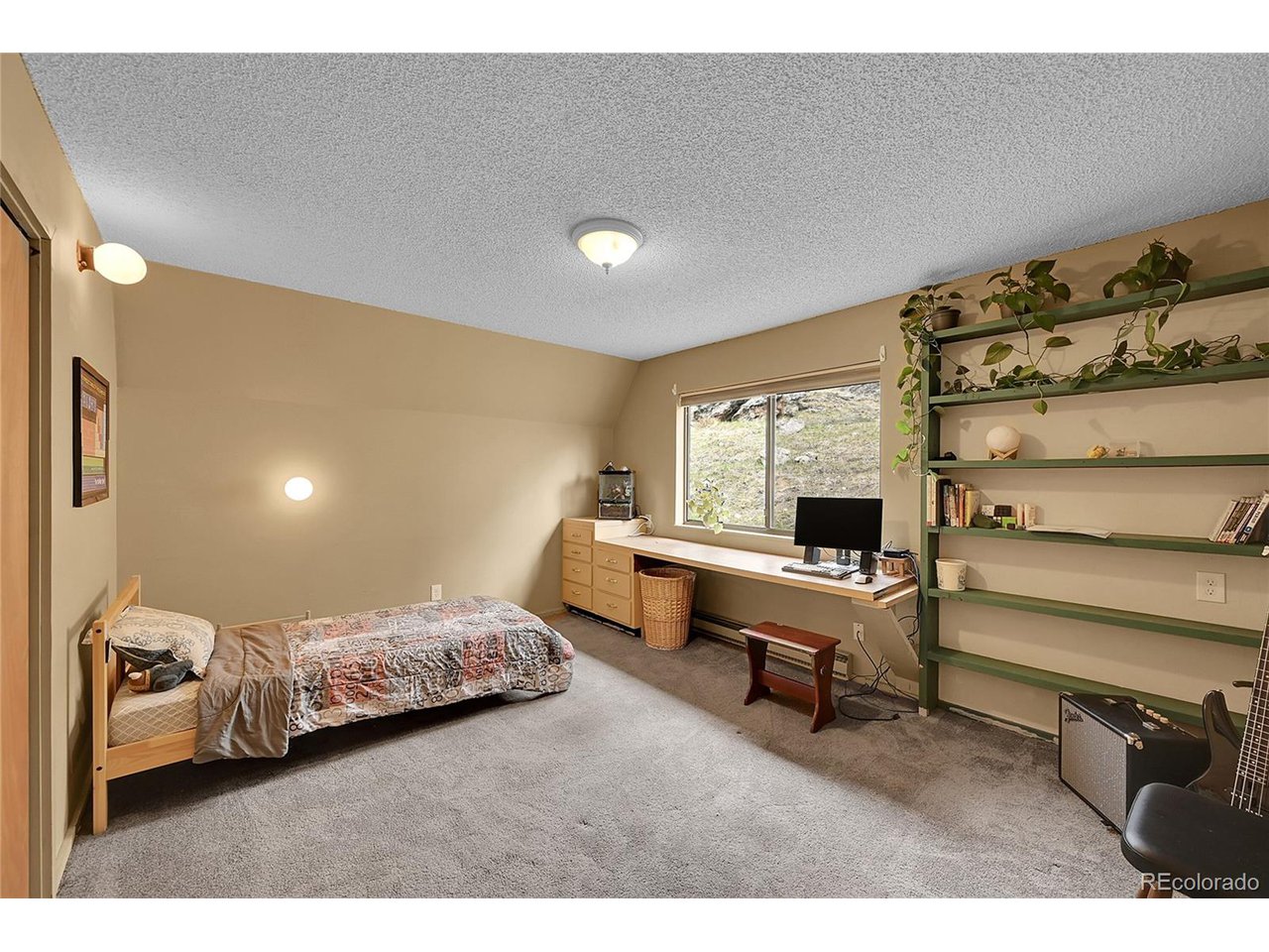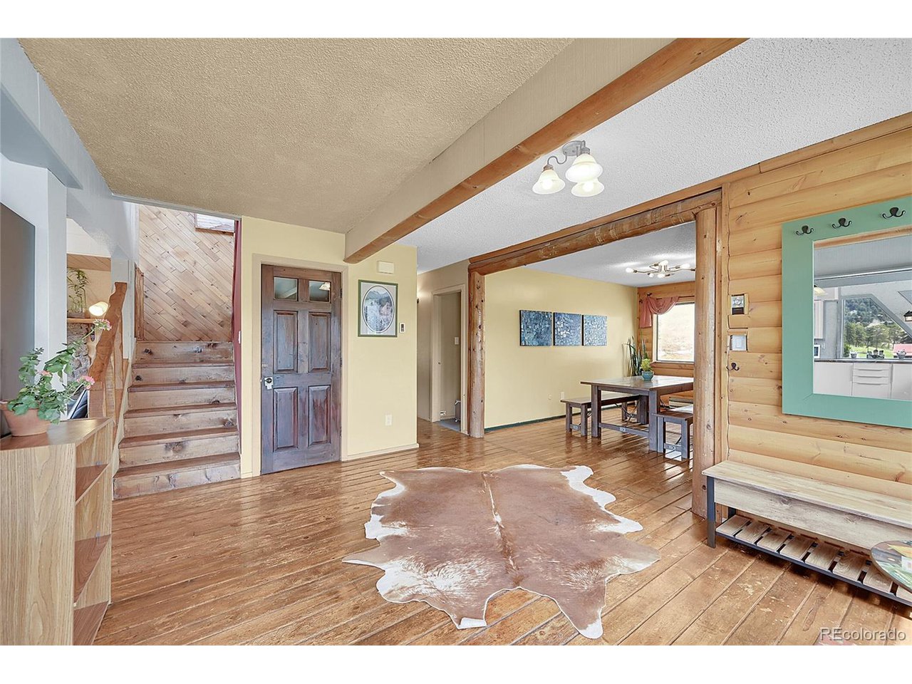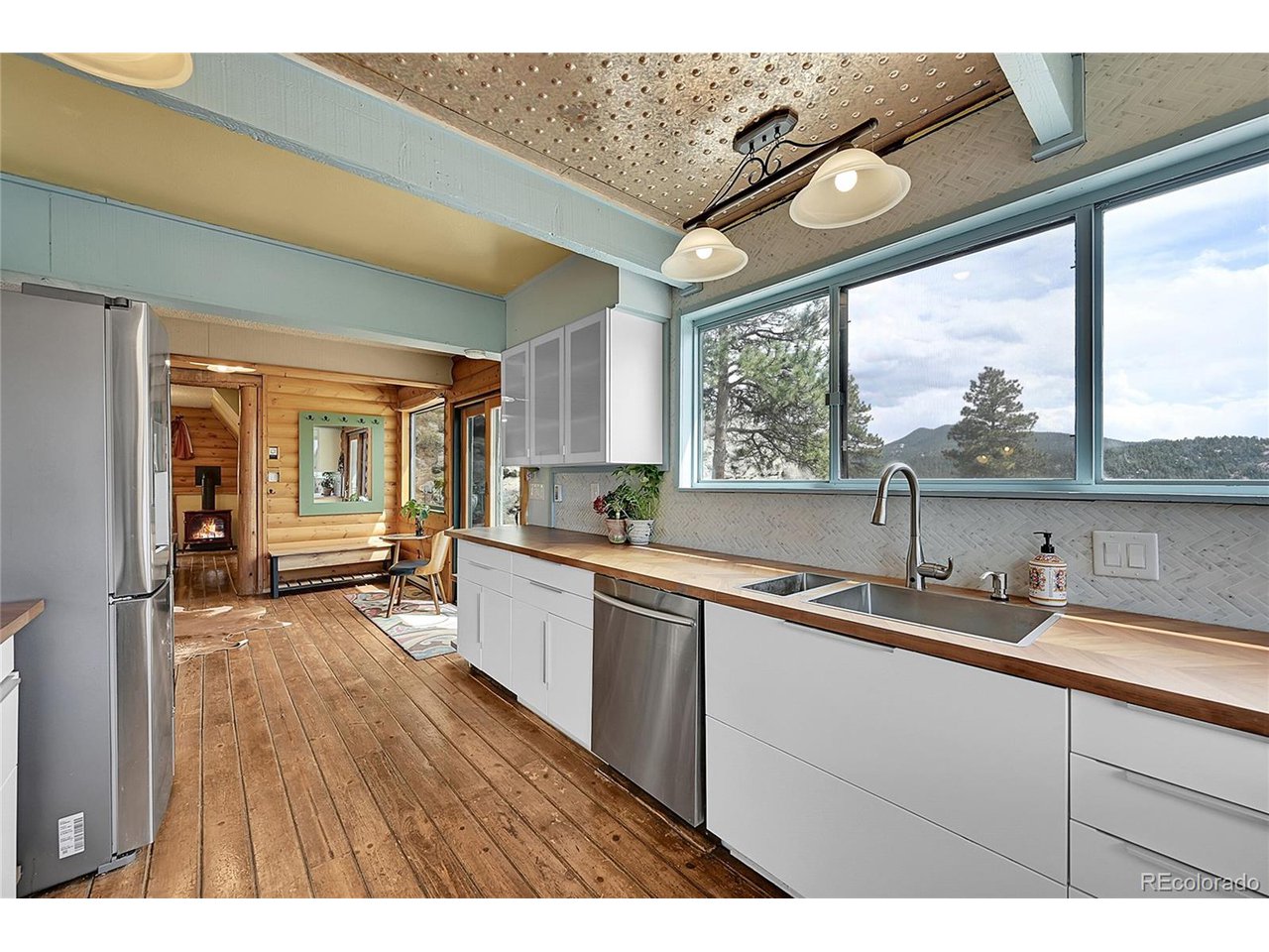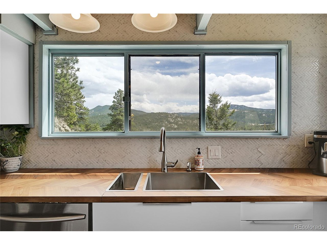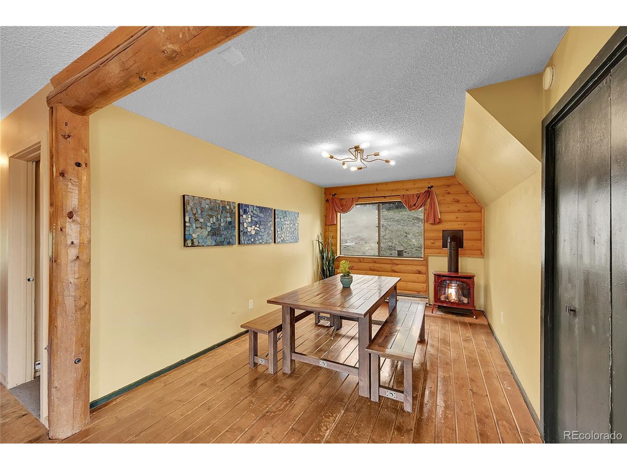 Nestled on a gorgeous 2.7 acres with usable flat land and terrific views, you will love this charming A frame. Approach the house on a flat driveway with plenty of parking and enjoy the large 3 car garage and with an additional workshop area. Inside, you will find a remodeled contemporary kitchen with large windows that takes advantage of the views. There is abundant sunshine and light throughout. The rustic hardwood floors and interior wood provide a cozy feel. The main floor has an open floor plan featuring the living room with gas fireplace and entrance to the large deck. You will also find a bedroom, bath and bonus room, currently used as a dining room with an additional gas stove. Upstairs find the primary retreat with a private balcony and a loft area. The lower level has a 3rd non-conforming bedroom and additional bonus space. Storage abounds! The expansive deck makes for great outdoor living with southern exposure, with lovely views and plenty of space. The 2.7 acre lot is just beautiful with rock outcroppings, big views, in addition to flat, very usable land. The property was professionally mitigated. Great internet too. This delightful neighborhood includes amenities such as a 20+ acre area with a community pond, tennis/pickle ball courts, play area, volleyball court and rentable barn for events. Lots of community gatherings too. It's just 9 minutes to Hwy 285 for a quick trip to Denver, and just 14 minutes to downtown Evergreen. Come home to delightful living!