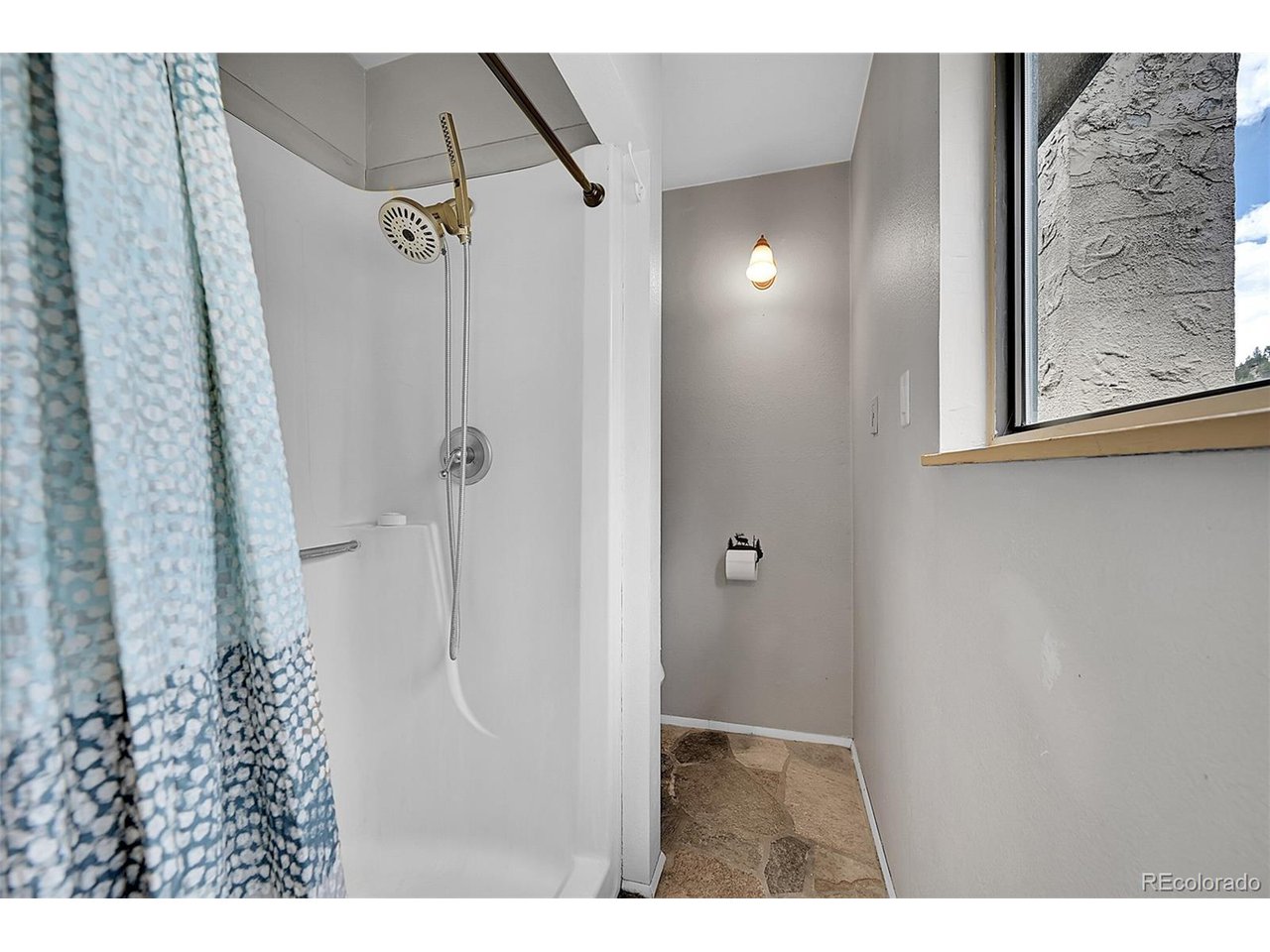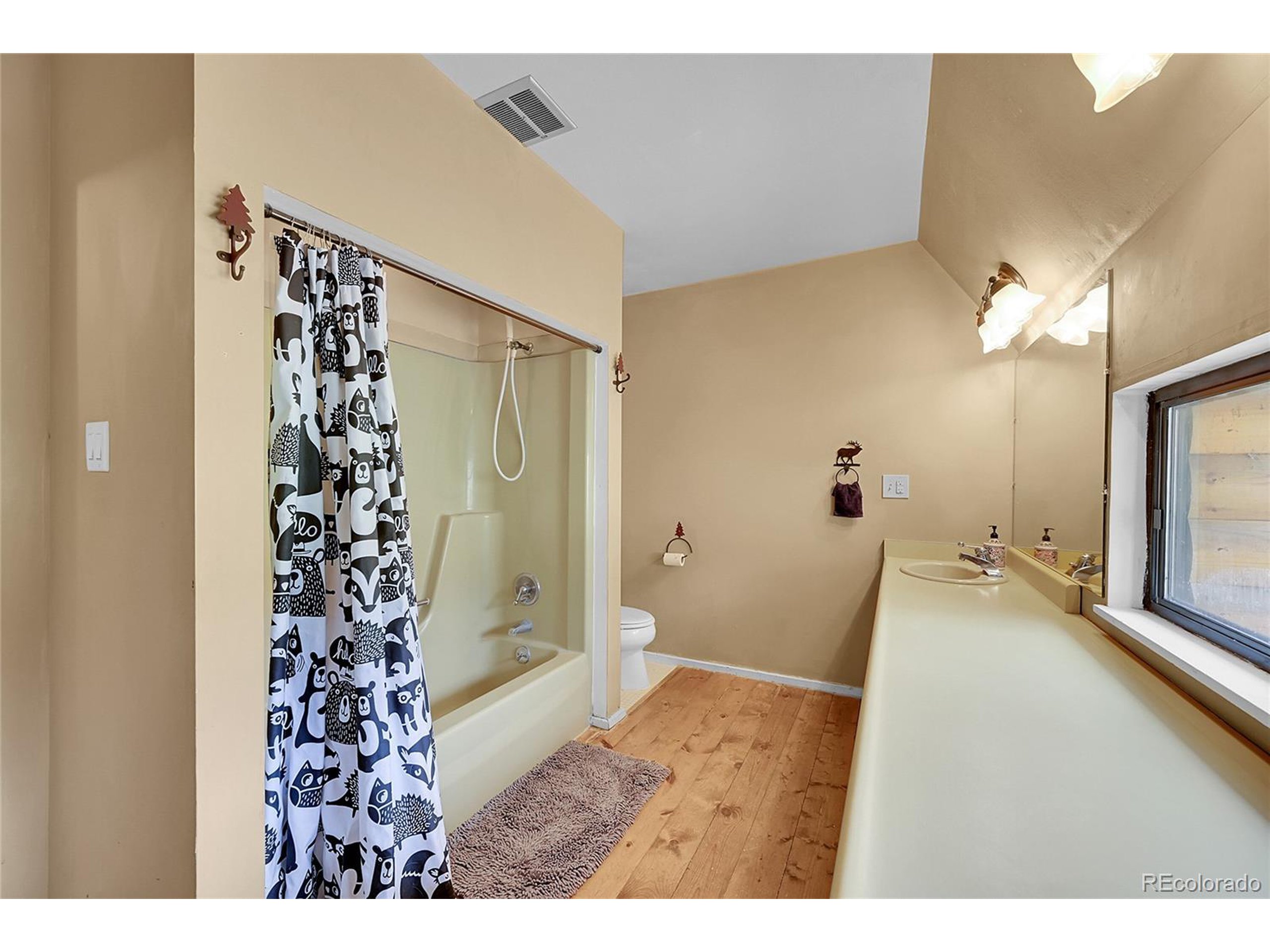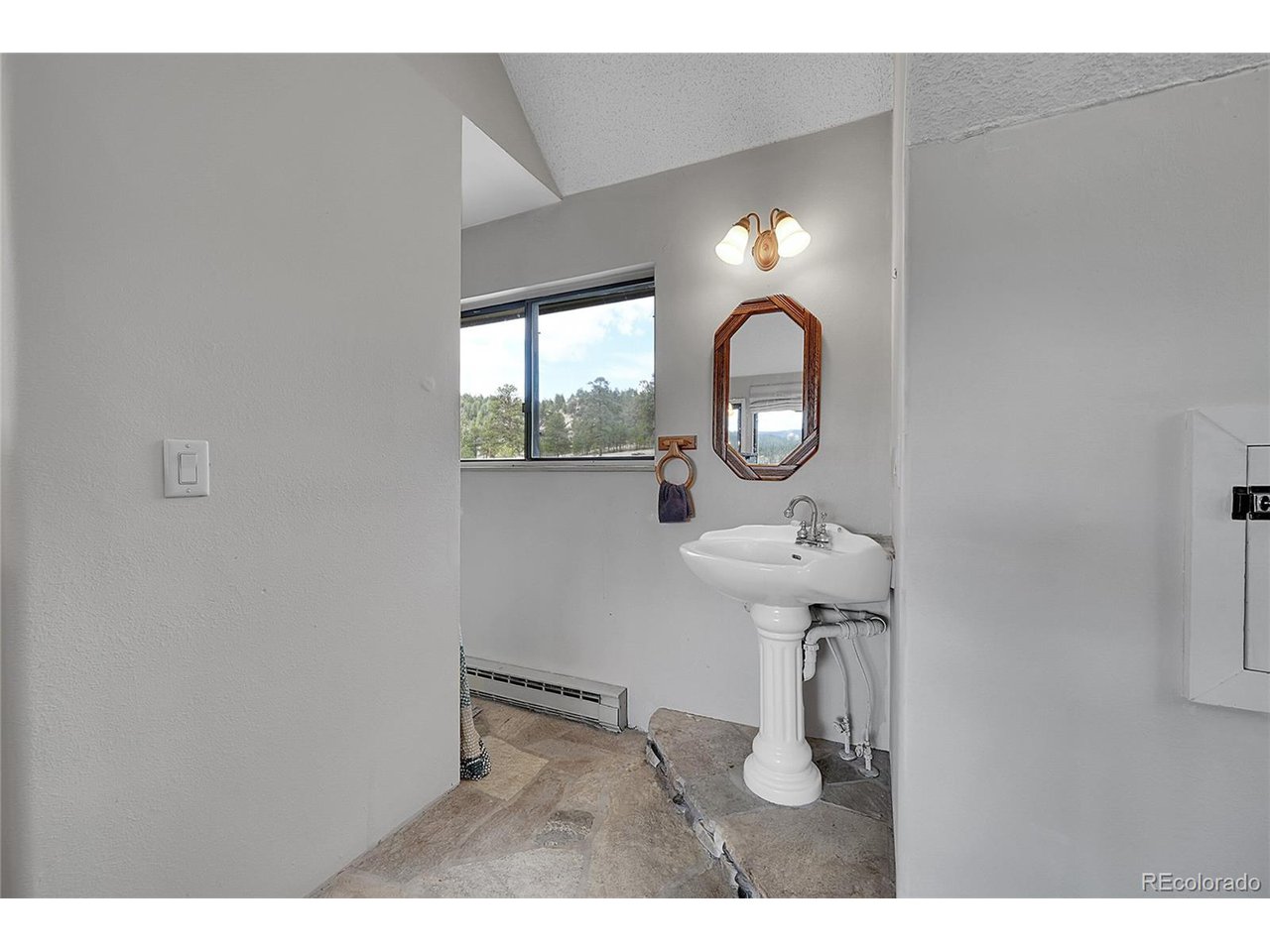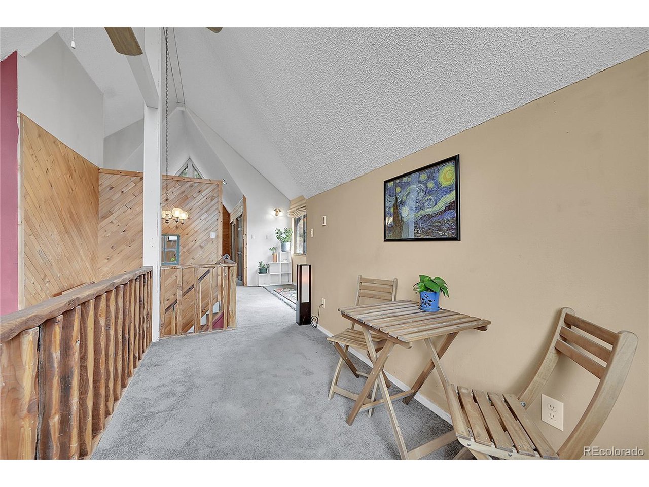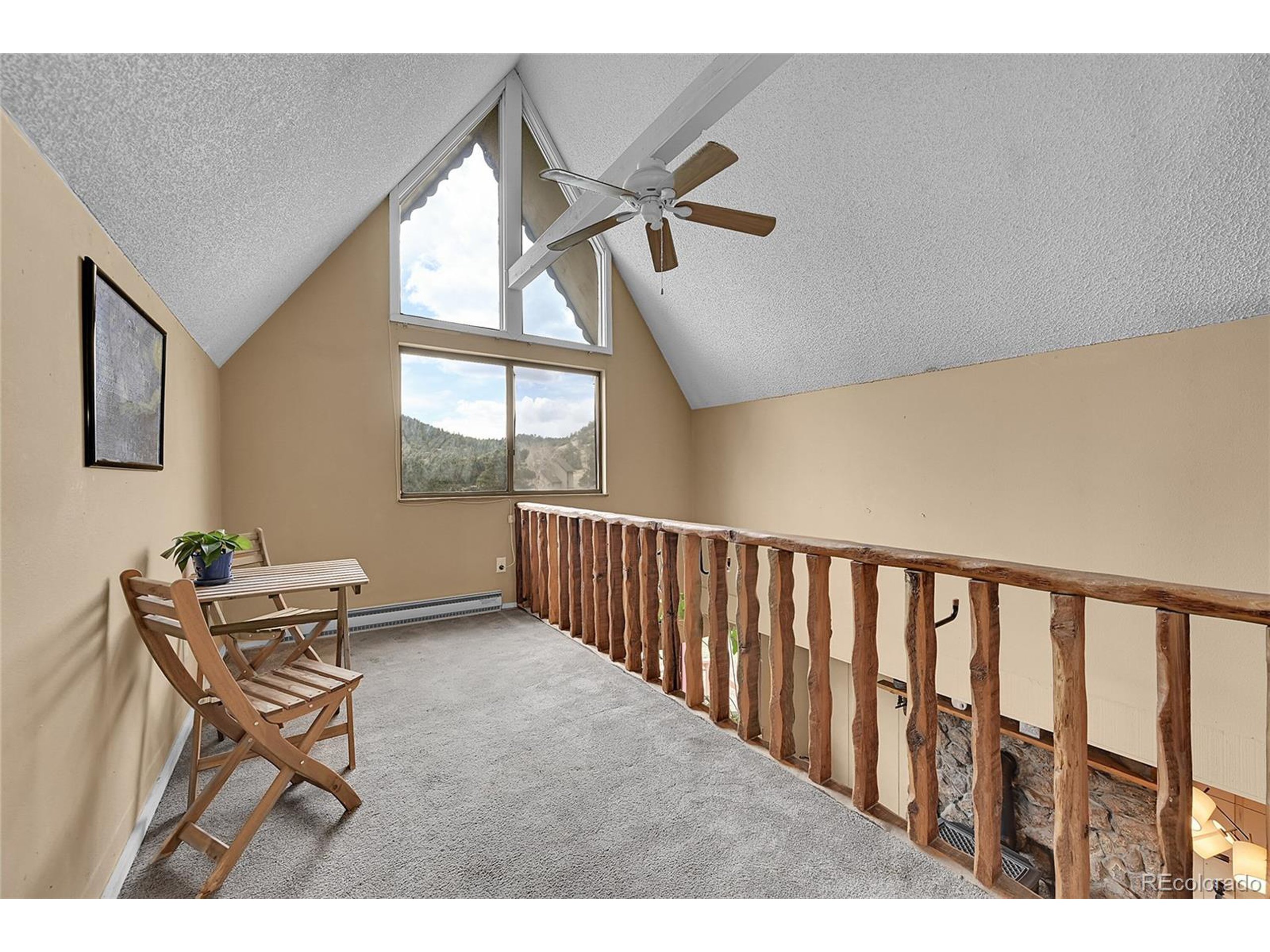 Nestled on a gorgeous 2.7 acres with usable flat land and terrific views, you will love this charming A frame. Approach the house on a flat driveway with plenty of parking and enjoy the large 3 car garage and with an additional workshop area. Inside, you will find a remodeled contemporary kitchen with large windows that takes advantage of the views. There is abundant sunshine and light throughout. The rustic hardwood floors and interior wood provide a cozy feel. The main floor has an open floor plan featuring the living room with gas fireplace and entrance to the large deck. You will also find a bedroom, bath and bonus room, currently used as a dining room with an additional gas stove. Upstairs find the primary retreat with a private balcony and a loft area. The lower level has a 3rd non-conforming bedroom and additional bonus space. Storage abounds! The expansive deck makes for great outdoor living with southern exposure, with lovely views and plenty of space. The 2.7 acre lot is just beautiful with rock outcroppings, big views, in addition to flat, very usable land. The property was professionally mitigated. Great internet too. This delightful neighborhood includes amenities such as a 20+ acre area with a community pond, tennis/pickle ball courts, play area, volleyball court and rentable barn for events. Lots of community gatherings too. It's just 9 minutes to Hwy 285 for a quick trip to Denver, and just 14 minutes to downtown Evergreen. Come home to delightful living!