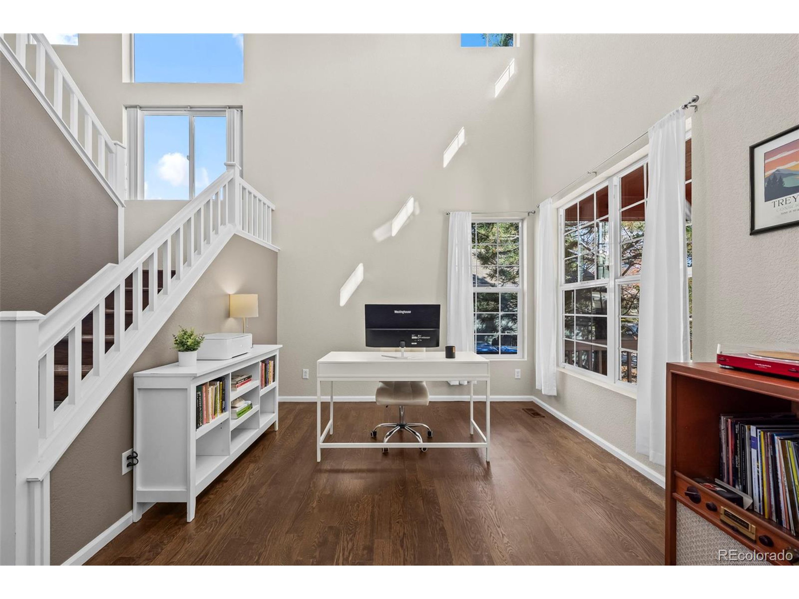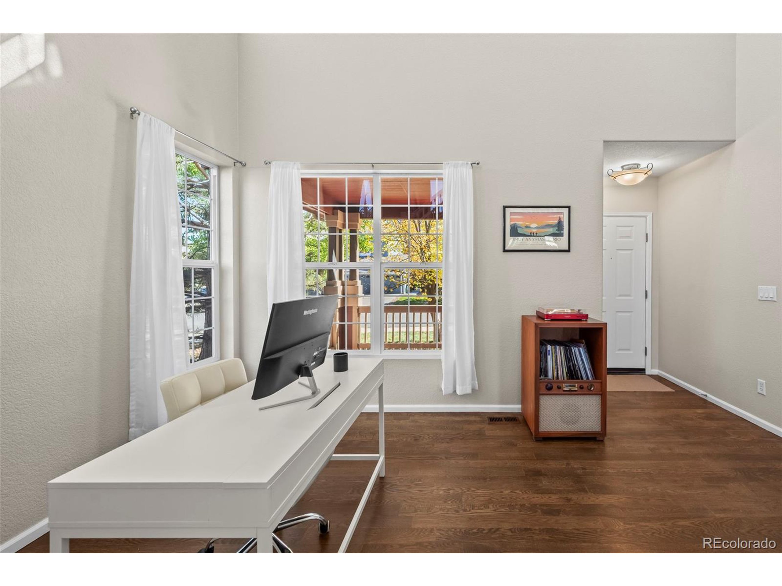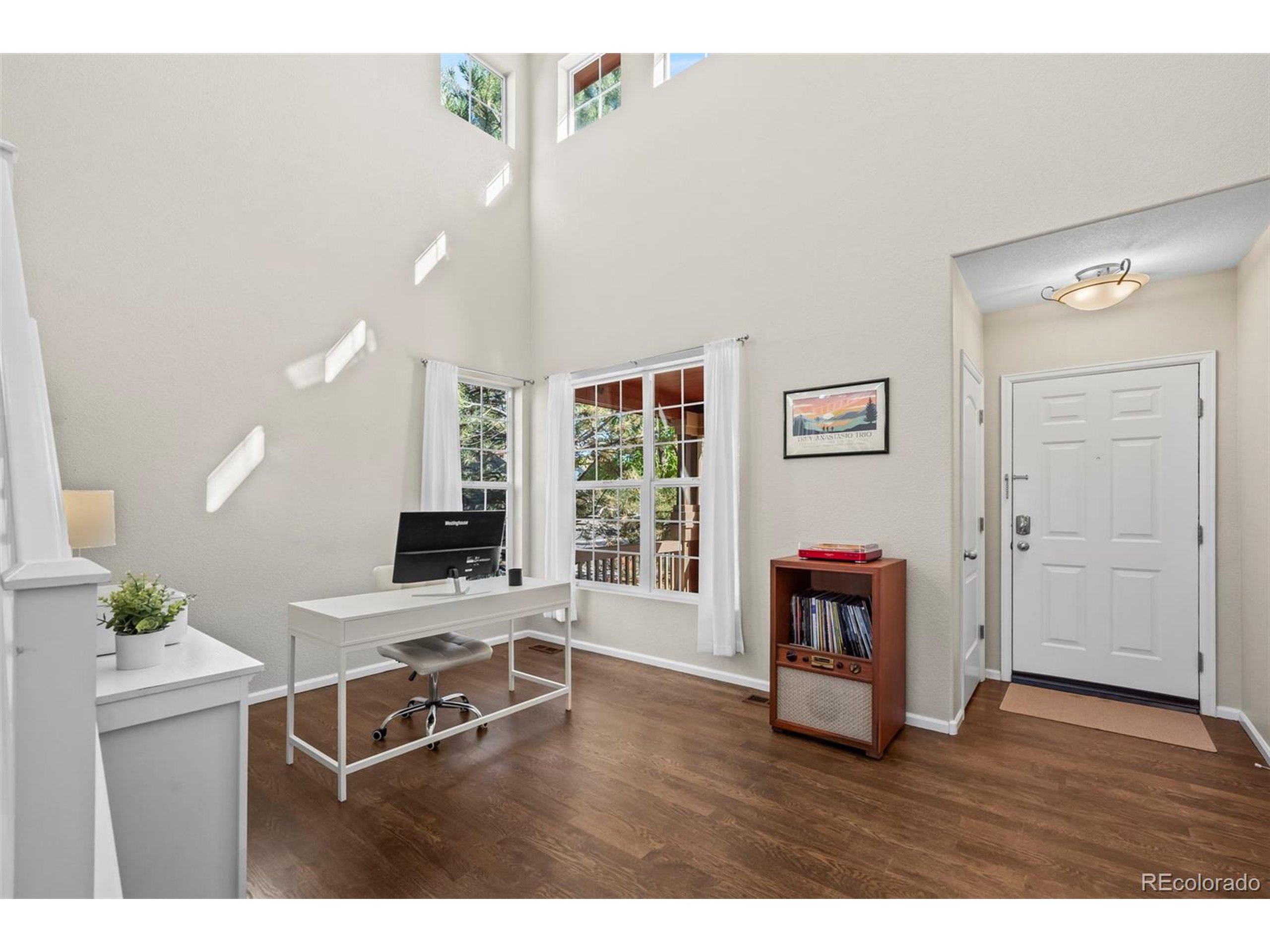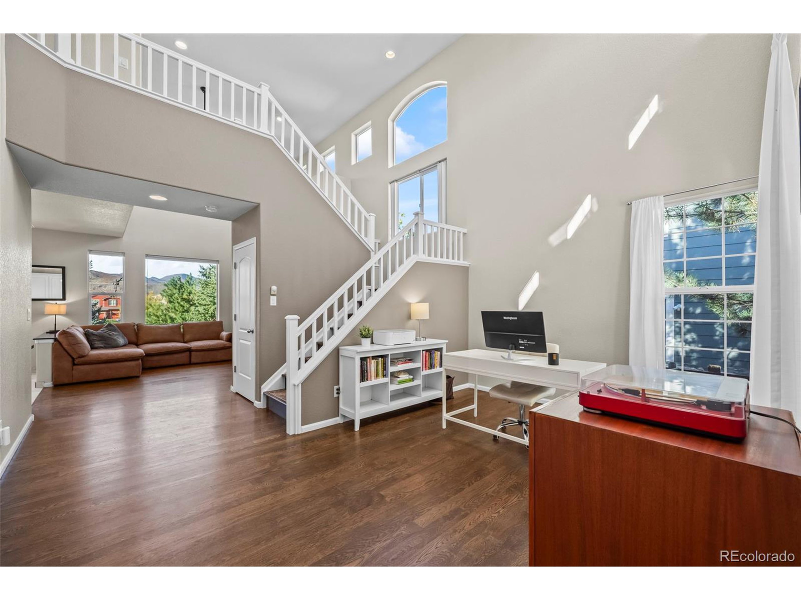 Enjoy breathtaking, unobstructed MOUNTAIN VIEWS from this beautifully updated home in Roxborough Village. Soaring vaulted ceilings, tall windows, and an open floor plan fill the home with natural light and frame the incredible backdrop of Colorado's Front Range. The main-level living room features a gas fireplace, custom built-ins, and expansive windows showcasing the mountain views, seamlessly connecting to the updated kitchen with newer stainless steel appliances, a kitchen island, and ample counter and storage space, including a large pantry. From the kitchen, step out to the spacious west-facing deck to take in the sunset over the mountains and enjoy true indoor/outdoor living. The front room-currently used as an office-offers flexible space and would make an ideal formal dining room. The main level also includes a powder bath, a large laundry room, and an attached two-car garage. Upstairs, the primary suite captures stunning mountain views and features a en suite bath and large walk-in closet. Two additional bedrooms and a full bath complete the upper level. Ideally located near open space and scenic trails, including Crystal Lake, Roxborough State Park, and the Arrowhead Golf Course, this home offers the best of Colorado living. Shops, restaurants, and groceries are all within walking distance. Don't miss this opportunity to own a home with unbeatable views and an incredible lifestyle!