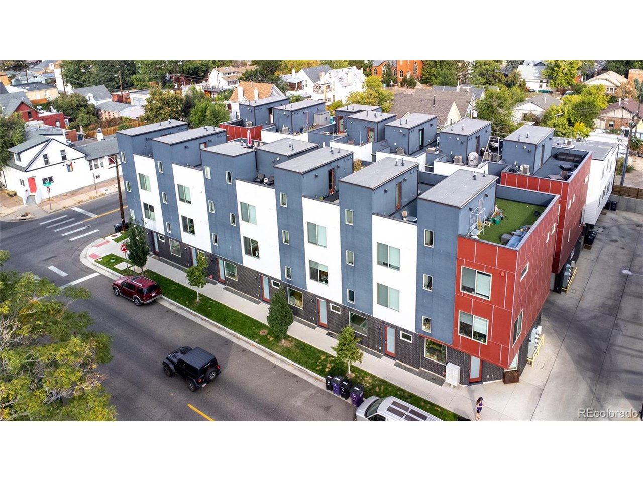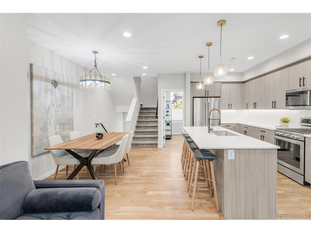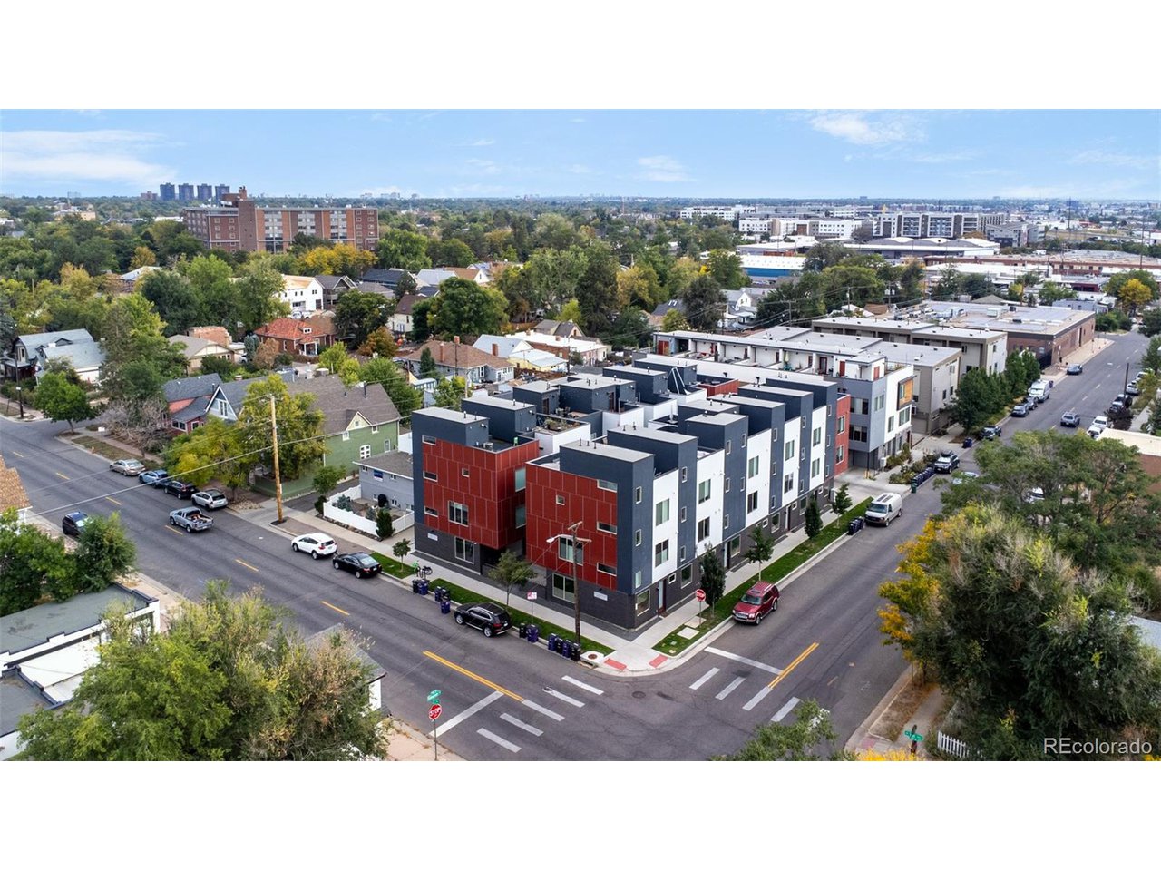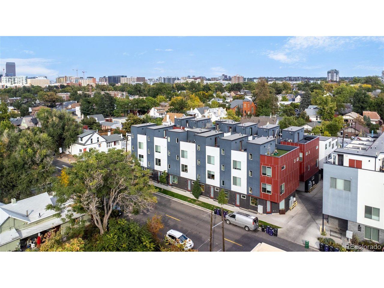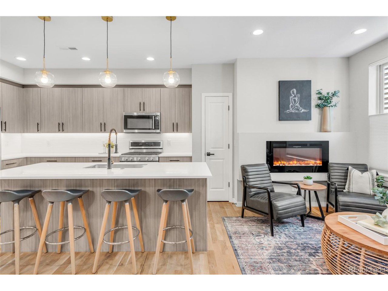 Tucked in the heart of Baker, this townhome is crowned by an impressive rooftop deck with stunning views. Recently built in 2019, the interior boasts contemporary finishes with updated lighting and hardware upgraded from the original builder-grade selections. White oak hardwood flooring flows throughout an open floorplan bathed in natural light from double-pane windows. Enjoy crafting recipes in an eat-in kitchen featuring a center island, sizable pantry, Porcelanosa tile and Krion countertops. Illuminated by an eye-catching chandelier, the dining area seamlessly extends into a living area centered by a modern fireplace. One of three bedrooms, the primary suite features a serene bath with a double vanity. Ample storage throughout includes walk-in closets and an insulated garage. Outdoor relaxation awaits on a rooftop deck boasting picturesque views. Located in the vibrant Baker neighborhood, residents enjoy easy access to trendy amenities and activities along Broadway and Santa Fe.