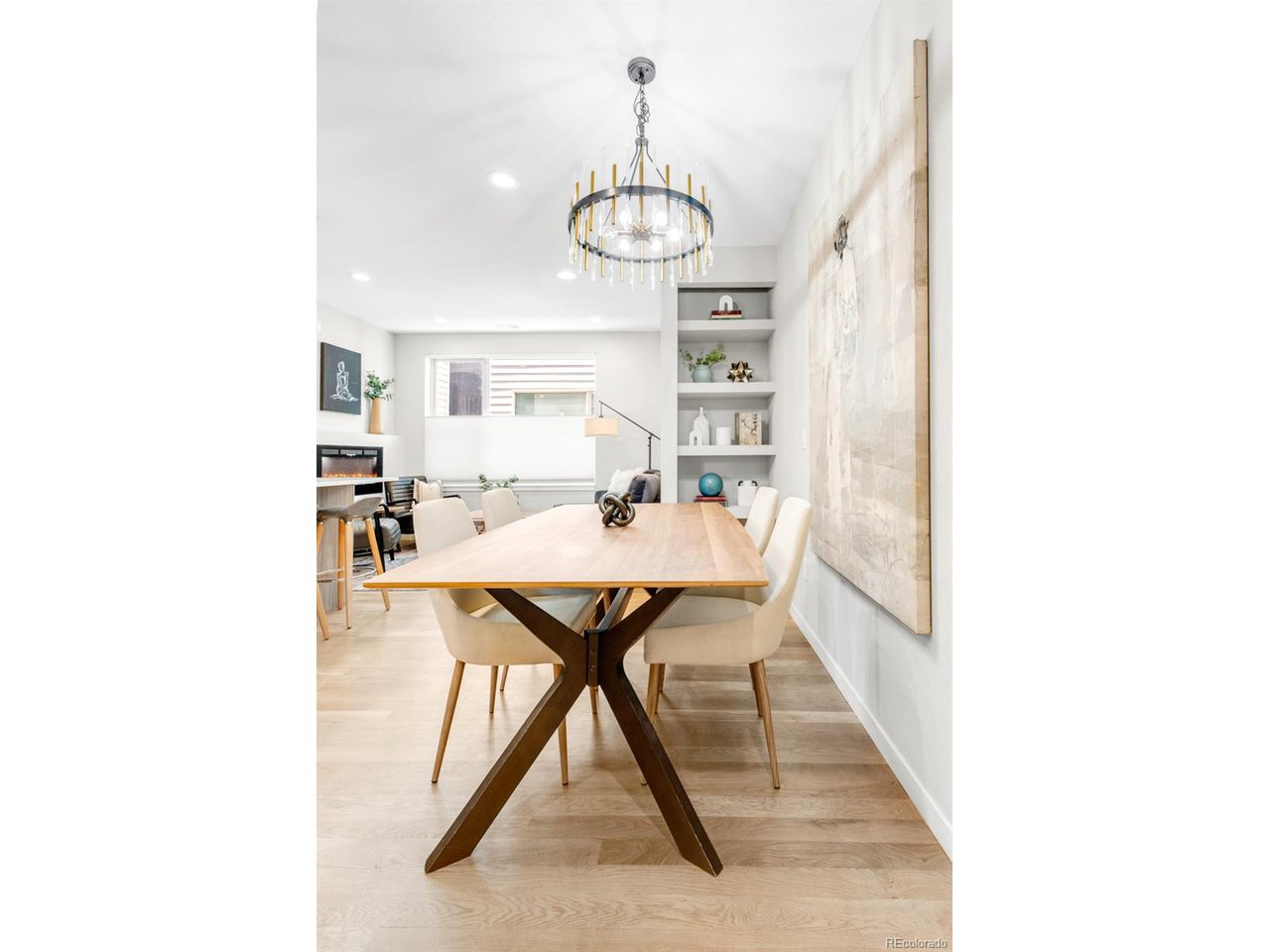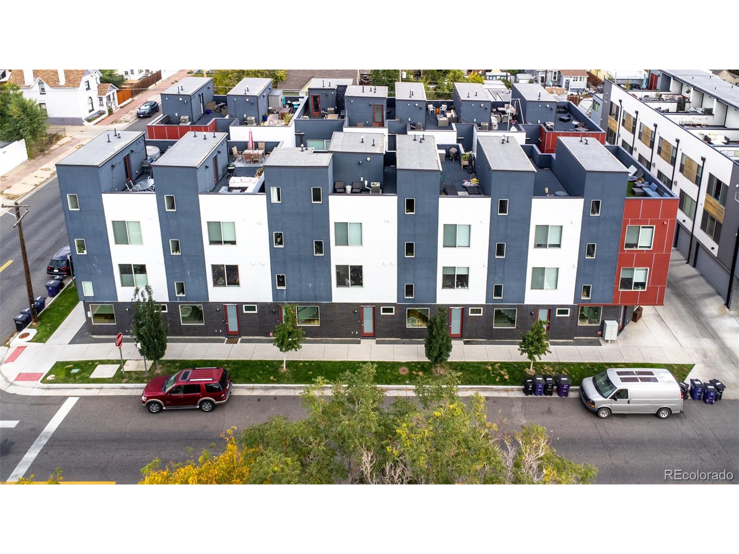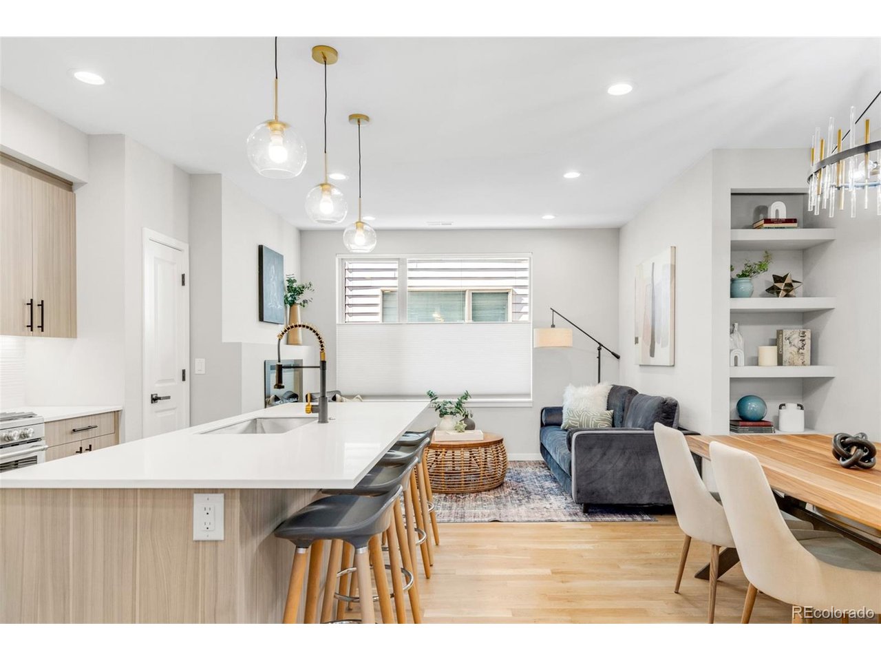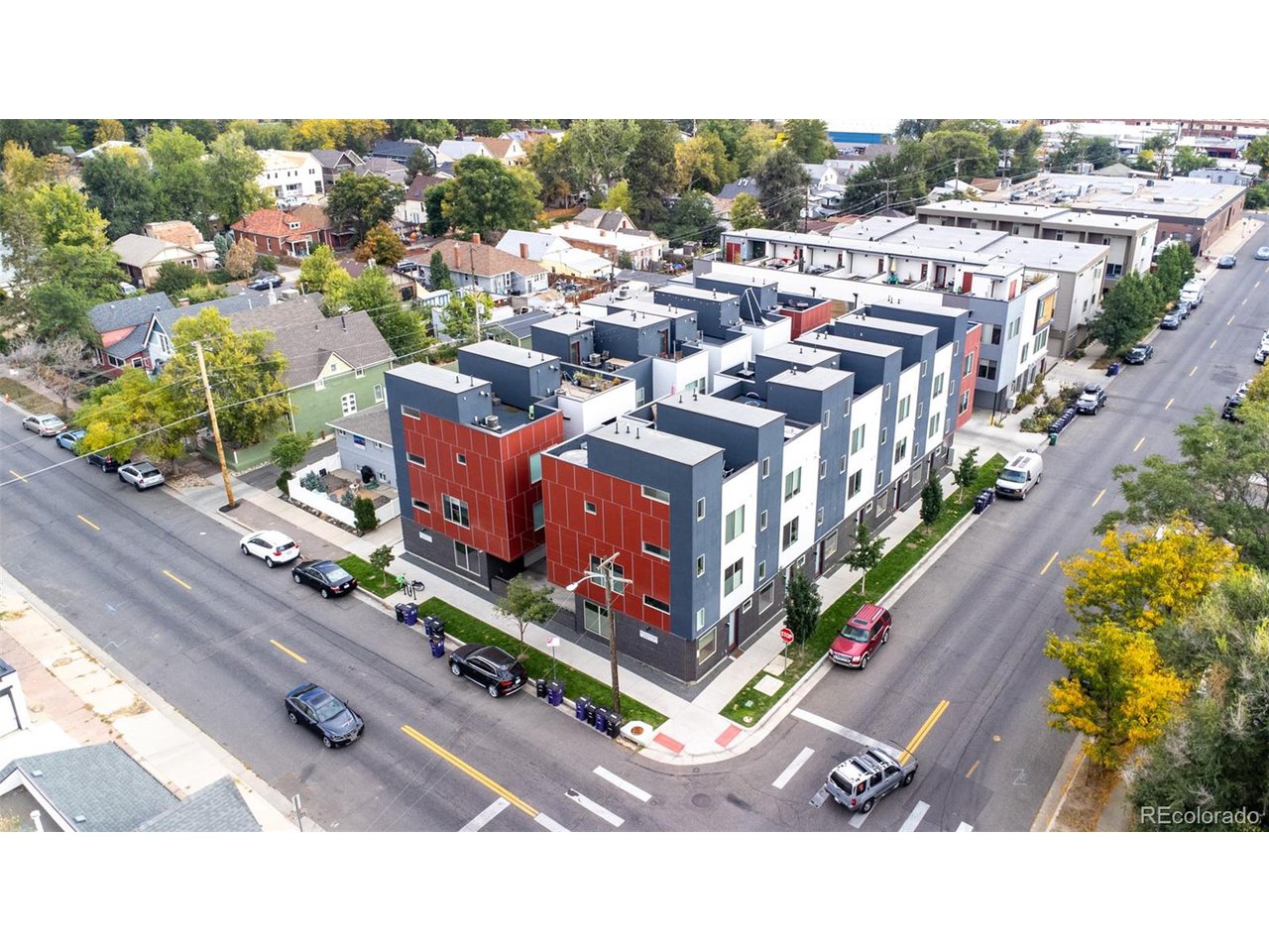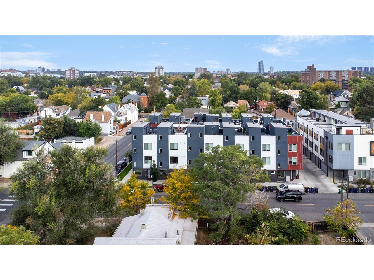Tucked in the heart of Baker, this townhome is crowned by an impressive rooftop deck with stunning views. Recently built in 2019, the interior boasts contemporary finishes with updated lighting and hardware upgraded from the original builder-grade selections. White oak hardwood flooring flows throughout an open floorplan bathed in natural light from double-pane windows. Enjoy crafting recipes in an eat-in kitchen featuring a center island, sizable pantry, Porcelanosa tile and Krion countertops. Illuminated by an eye-catching chandelier, the dining area seamlessly extends into a living area centered by a modern fireplace. One of three bedrooms, the primary suite features a serene bath with a double vanity. Ample storage throughout includes walk-in closets and an insulated garage. Outdoor relaxation awaits on a rooftop deck boasting picturesque views. Located in the vibrant Baker neighborhood, residents enjoy easy access to trendy amenities and activities along Broadway and Santa Fe.