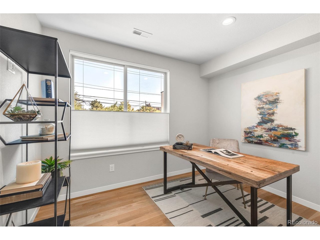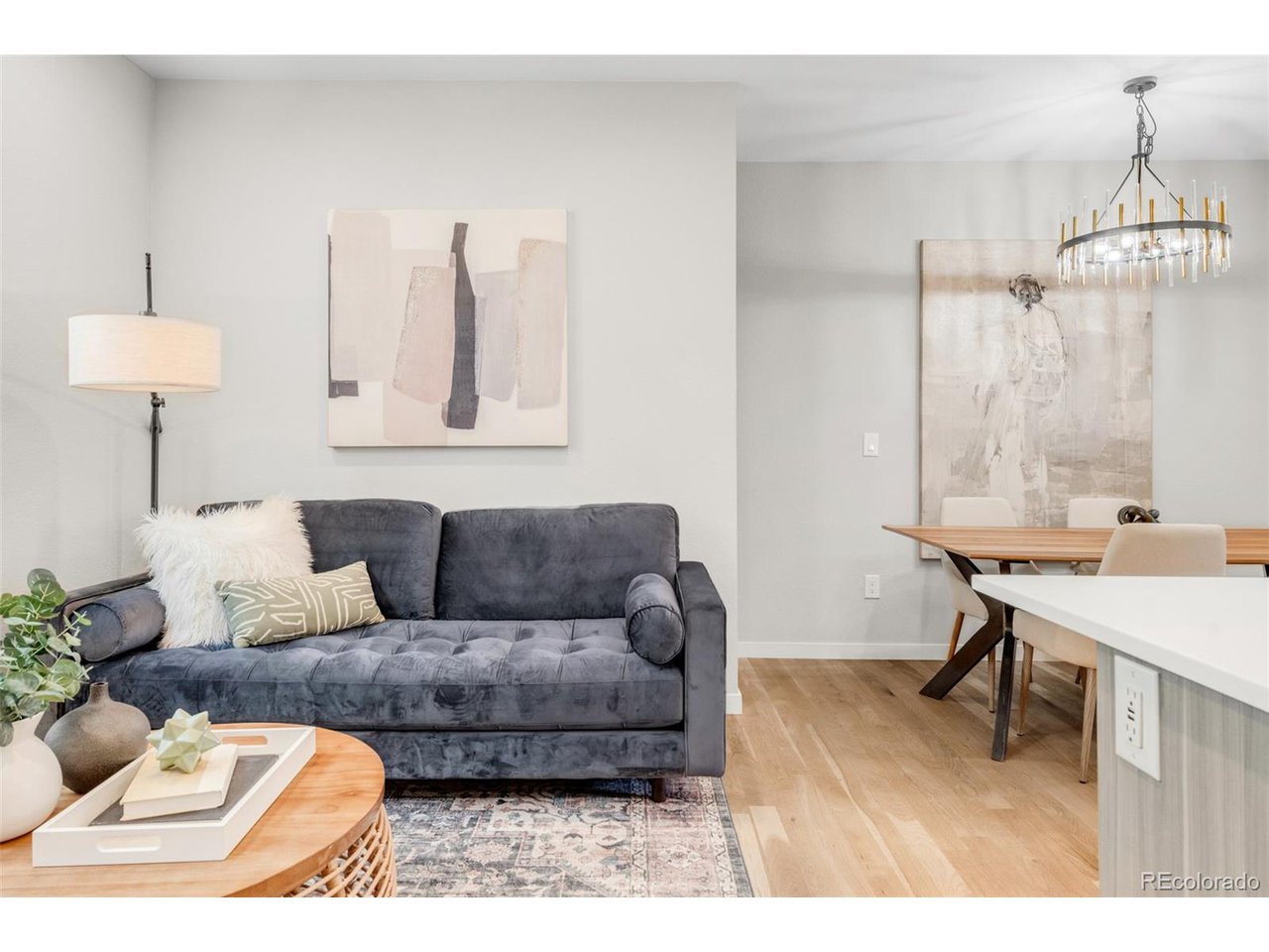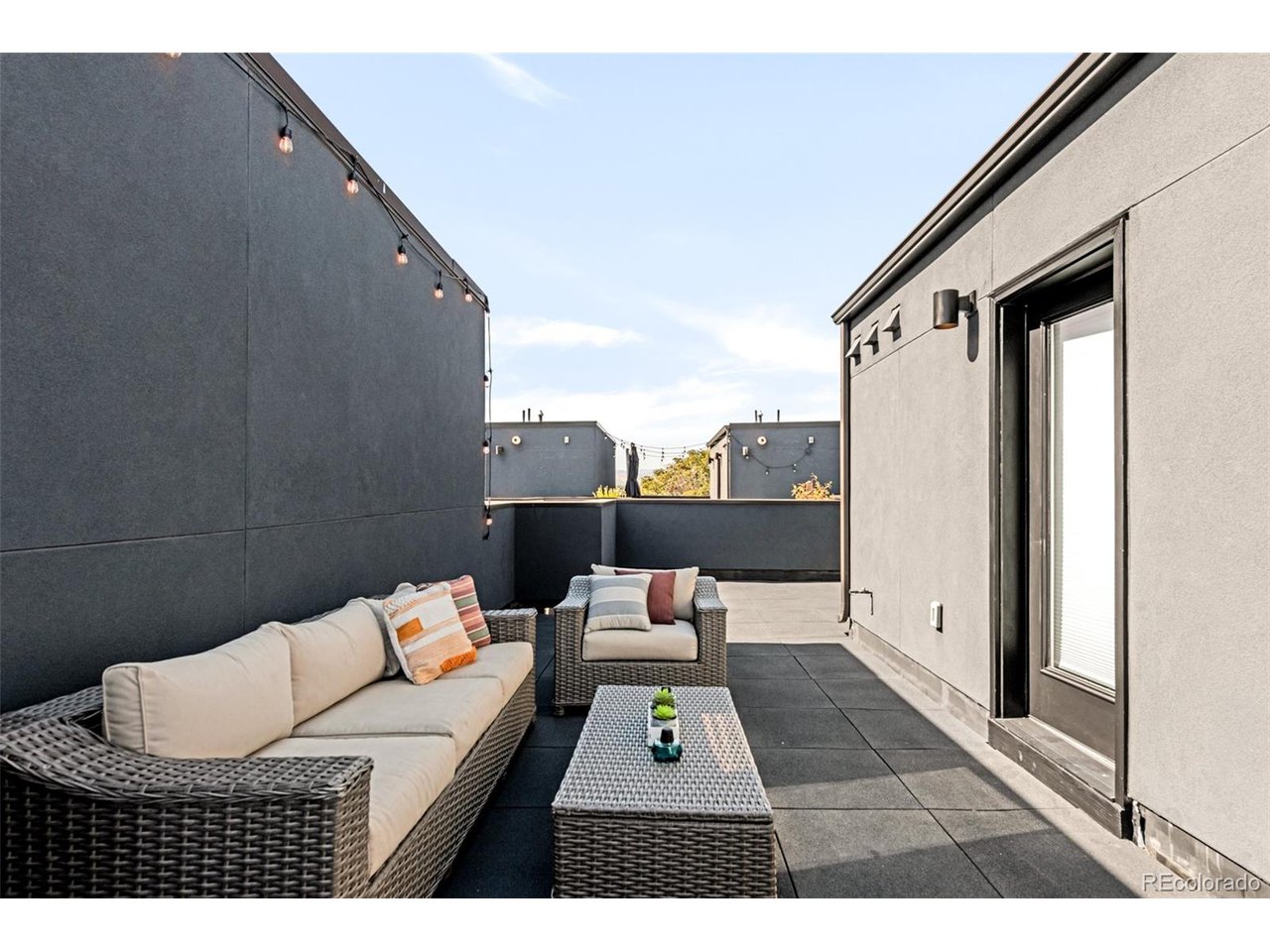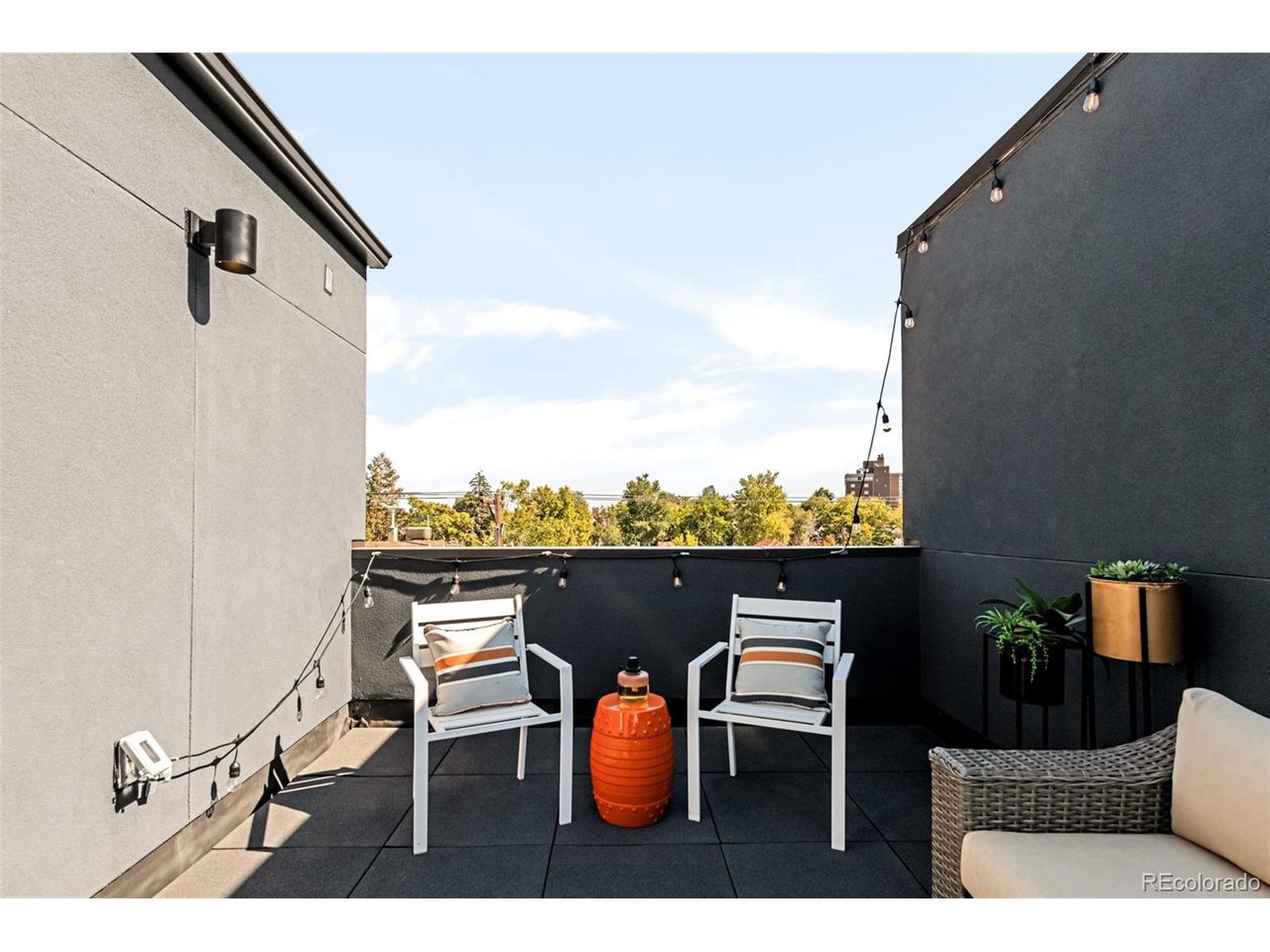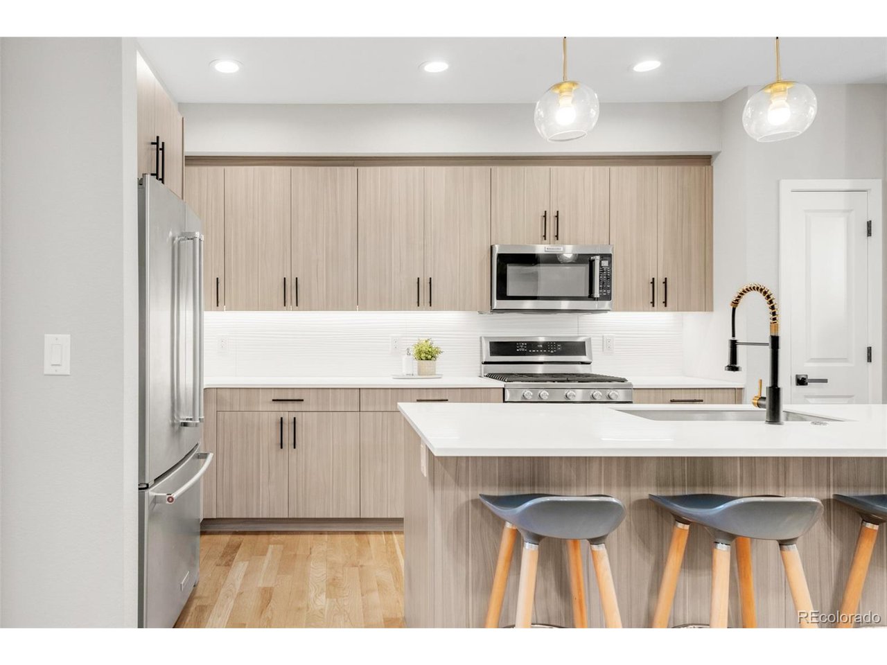 Tucked in the heart of Baker, this townhome is crowned by an impressive rooftop deck with stunning views. Recently built in 2019, the interior boasts contemporary finishes with updated lighting and hardware upgraded from the original builder-grade selections. White oak hardwood flooring flows throughout an open floorplan bathed in natural light from double-pane windows. Enjoy crafting recipes in an eat-in kitchen featuring a center island, sizable pantry, Porcelanosa tile and Krion countertops. Illuminated by an eye-catching chandelier, the dining area seamlessly extends into a living area centered by a modern fireplace. One of three bedrooms, the primary suite features a serene bath with a double vanity. Ample storage throughout includes walk-in closets and an insulated garage. Outdoor relaxation awaits on a rooftop deck boasting picturesque views. Located in the vibrant Baker neighborhood, residents enjoy easy access to trendy amenities and activities along Broadway and Santa Fe.